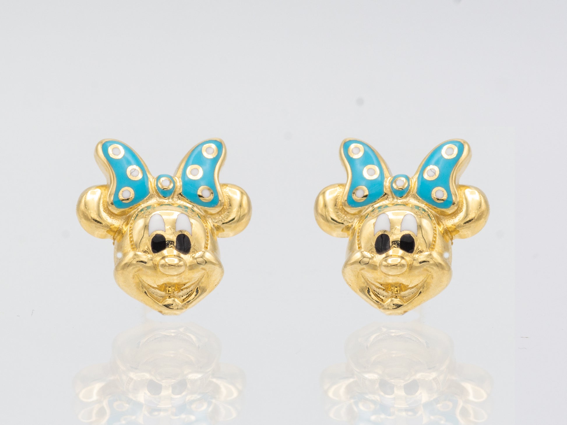 Add a touch of playful charm with these adorable 14K solid yellow gold Minnie Mouse stud earrings, complete with a beautifully detailed mint enamel bow for a fresh and whimsical finish.