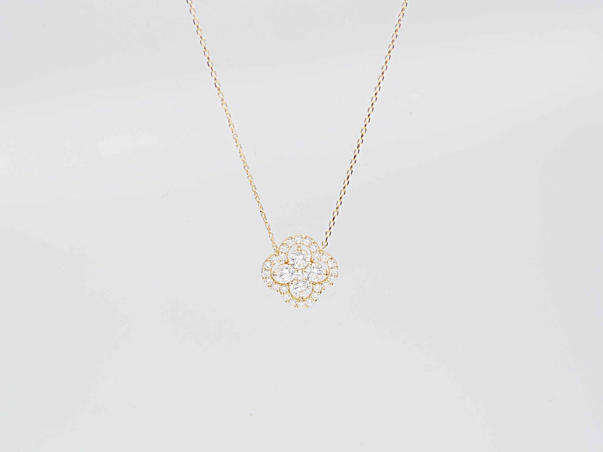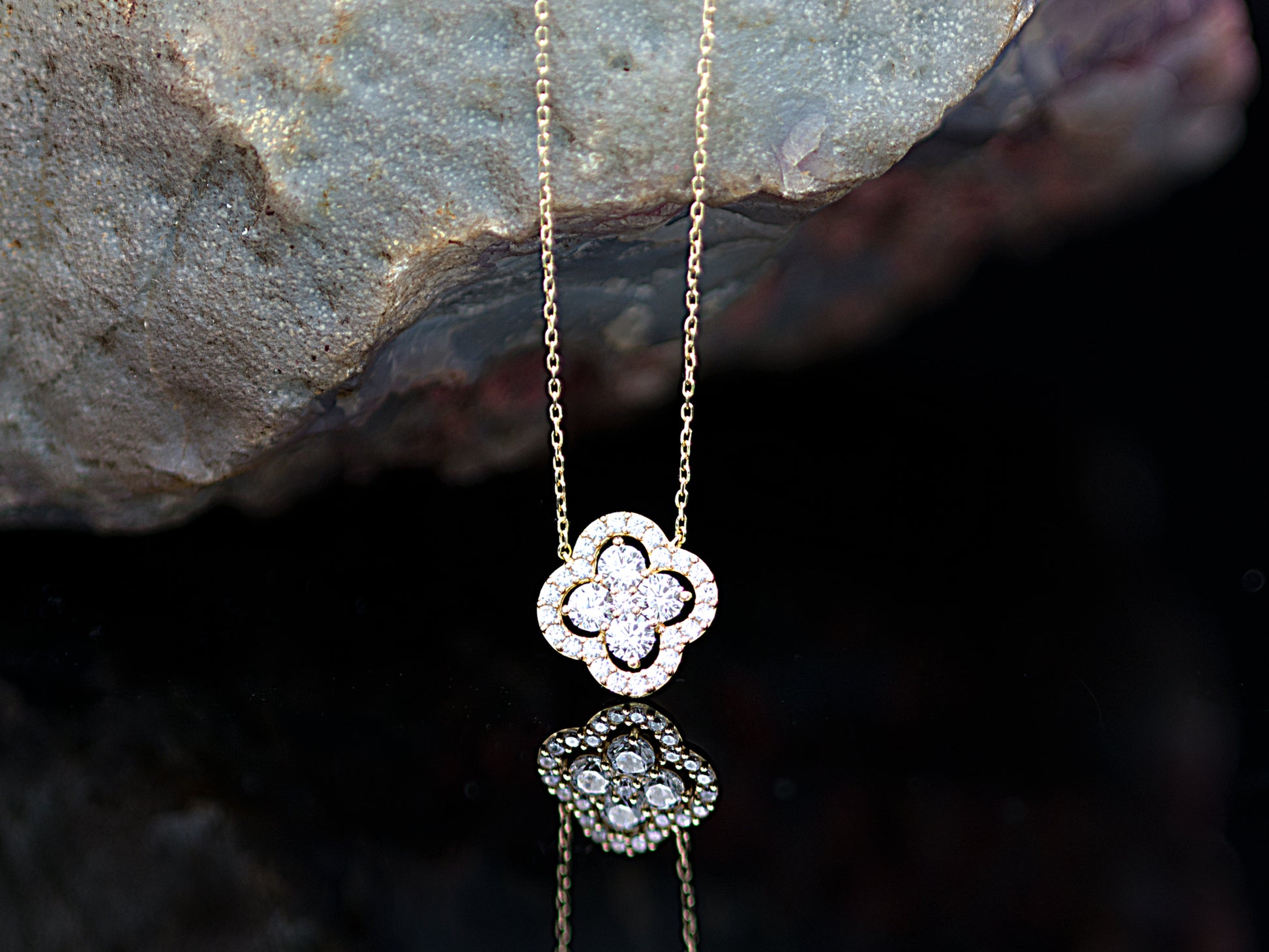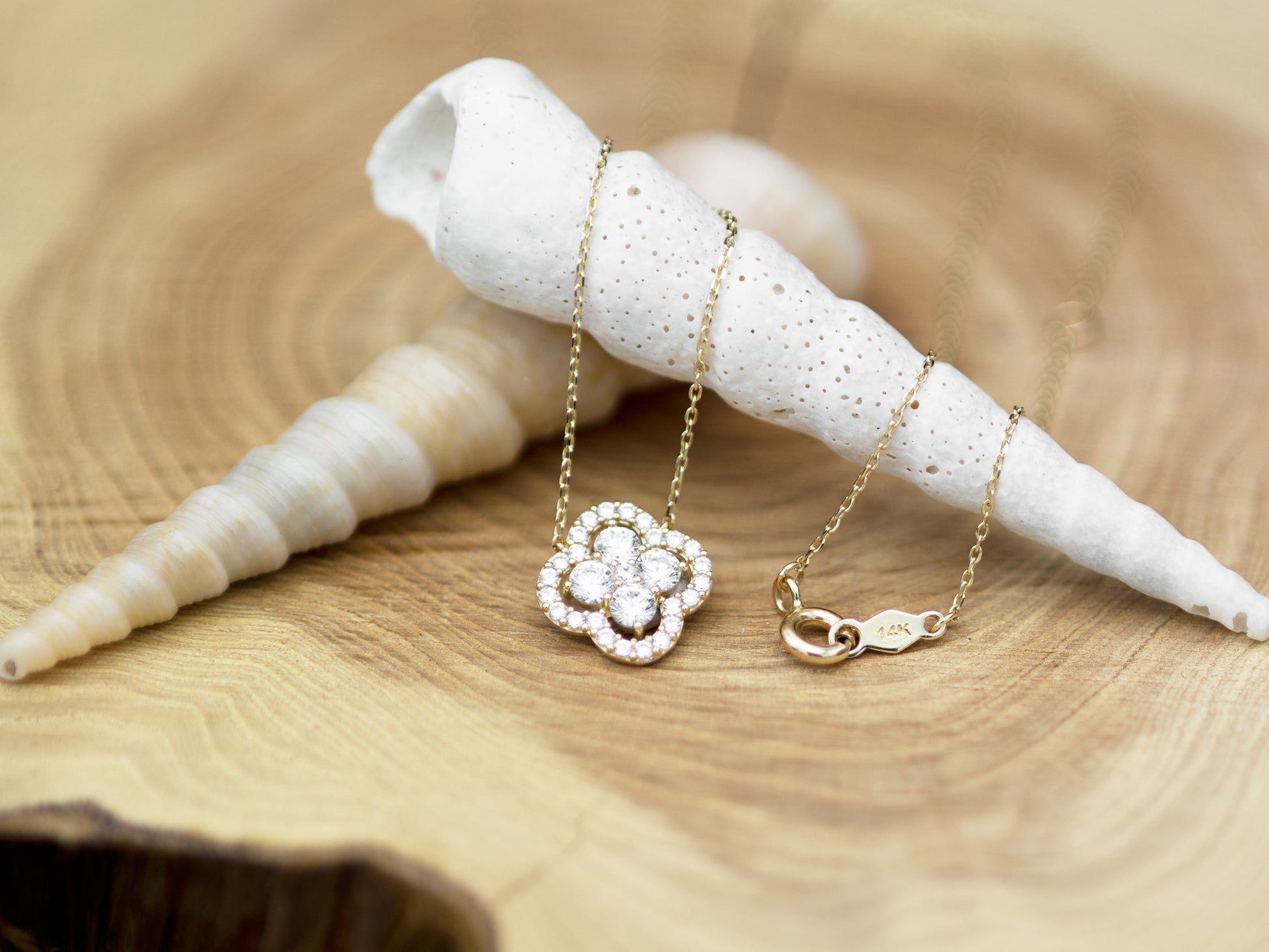 14K Genuine solid Gold with clover shape pendant featuring 5stones with Top Quality Sparkling Cubic Zirconia surrounding it in a halo-like effect.
