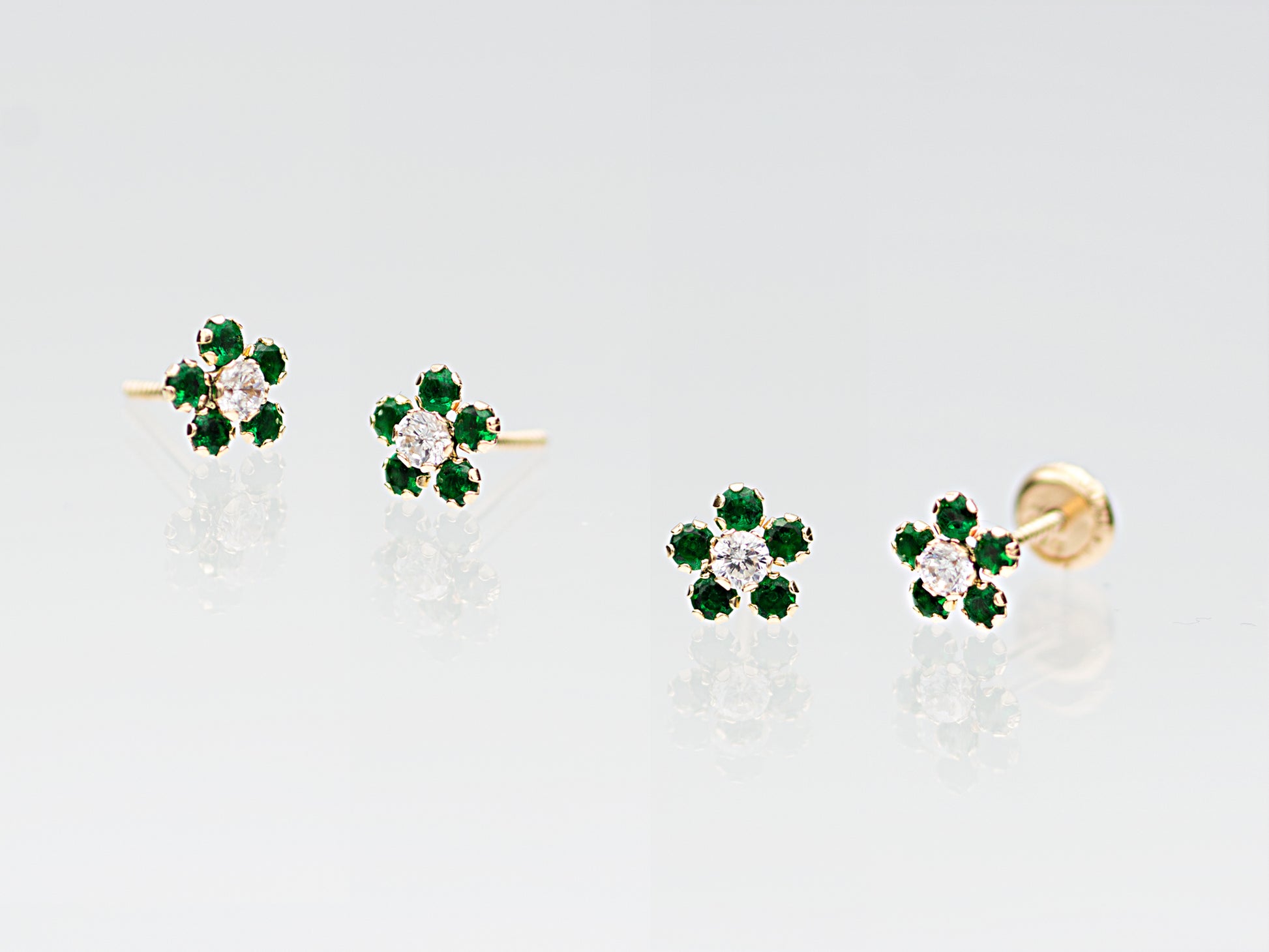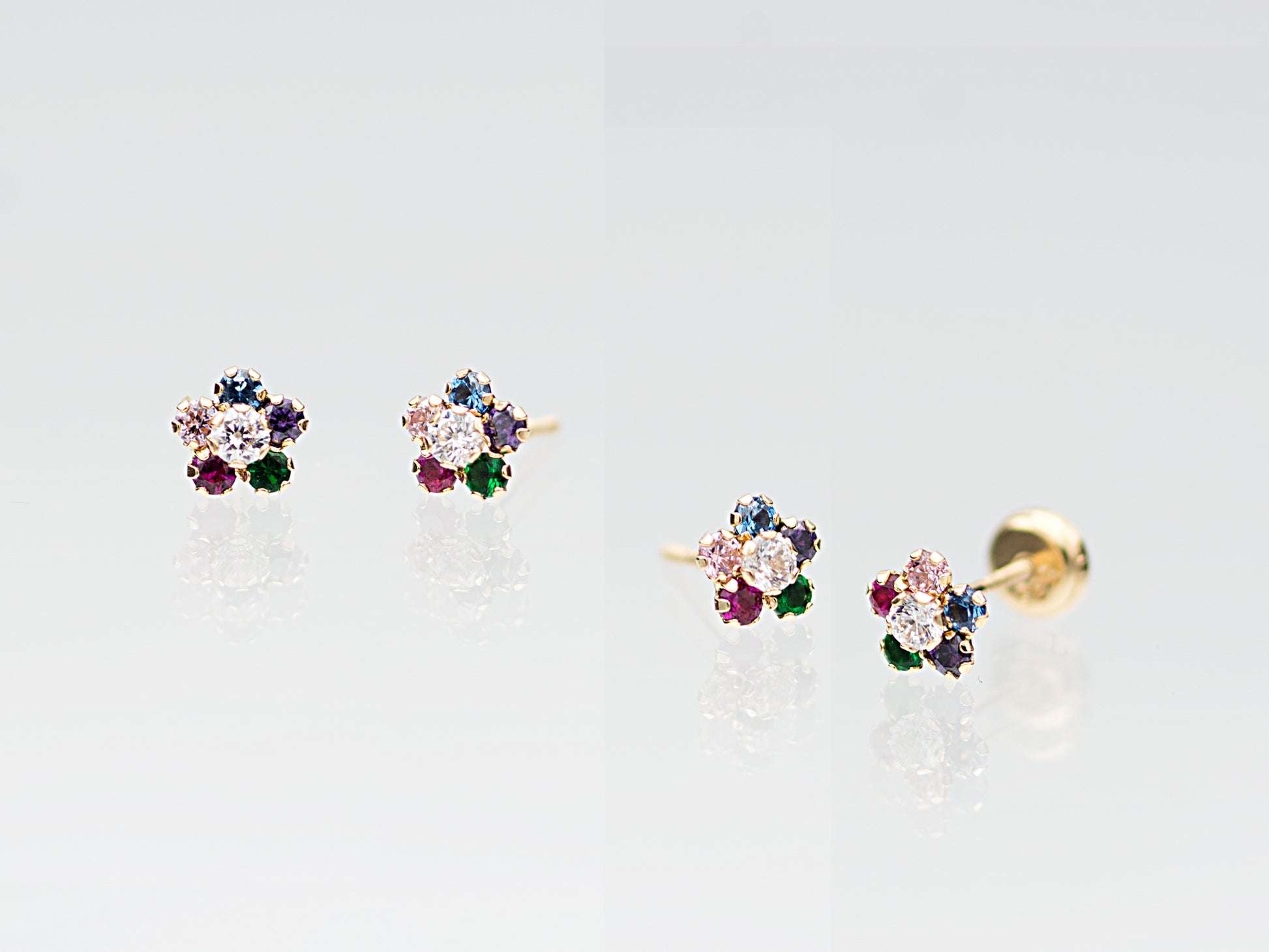 14K Solid Gold colorful Cubic zirconia flower stud earring, Tiny CZ earrings, Dainty floral studs screw back, gift for her and kids