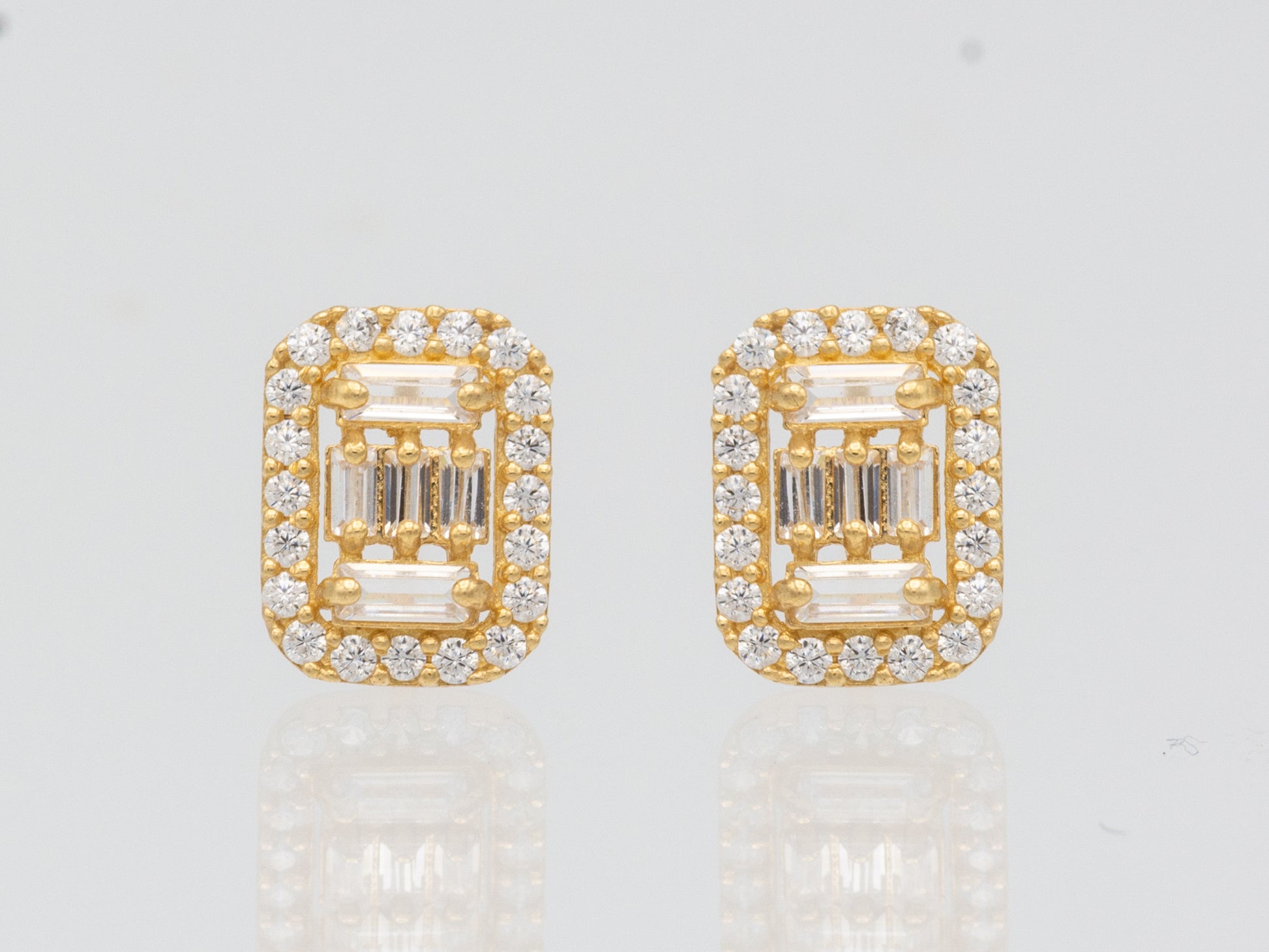 Crafted from 14k solid gold, these rectangular mosaic cluster earrings showcase a stunning blend of round and baguette simulated diamonds—offering a perfect harmony of modern design, brilliance, and elegance. Their sleek yet graceful style adds a touch of refined sparkle to any look, making them an ideal choice for both everyday wear and special occasions.