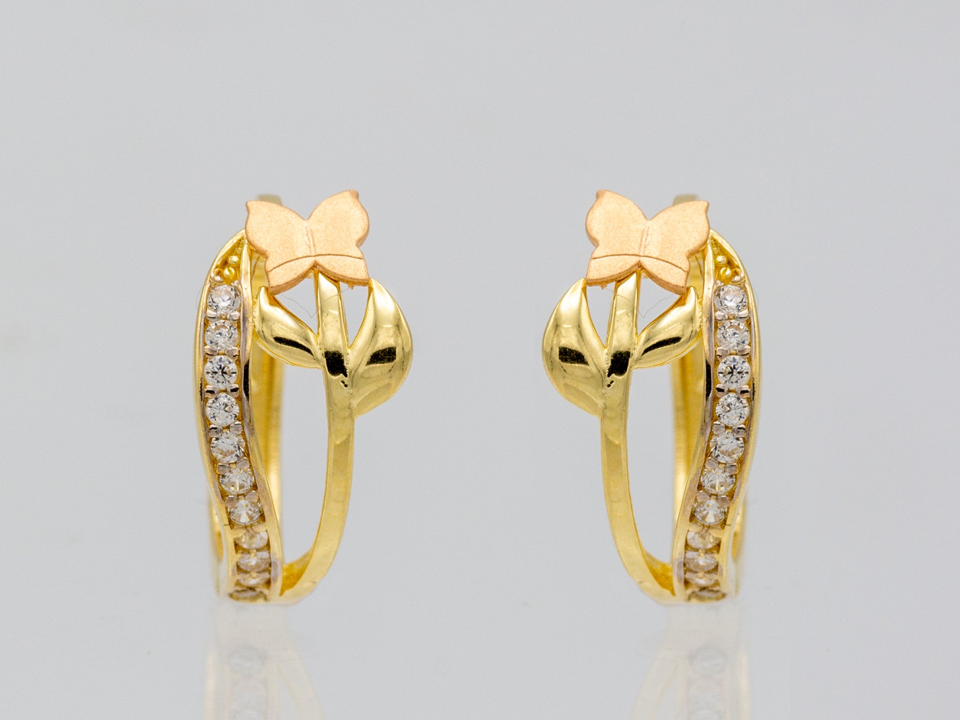 Delicate and feminine, these 14K solid gold flower huggie earrings are adorned with sparkling cubic zirconia accents that gracefully catch the light with every movement. Featuring a charming floral design, they offer a timeless elegance that makes them a perfect everyday favorite or a sweet accent for special occasions. A true wardrobe staple for those who love subtle sparkle and refined beauty.