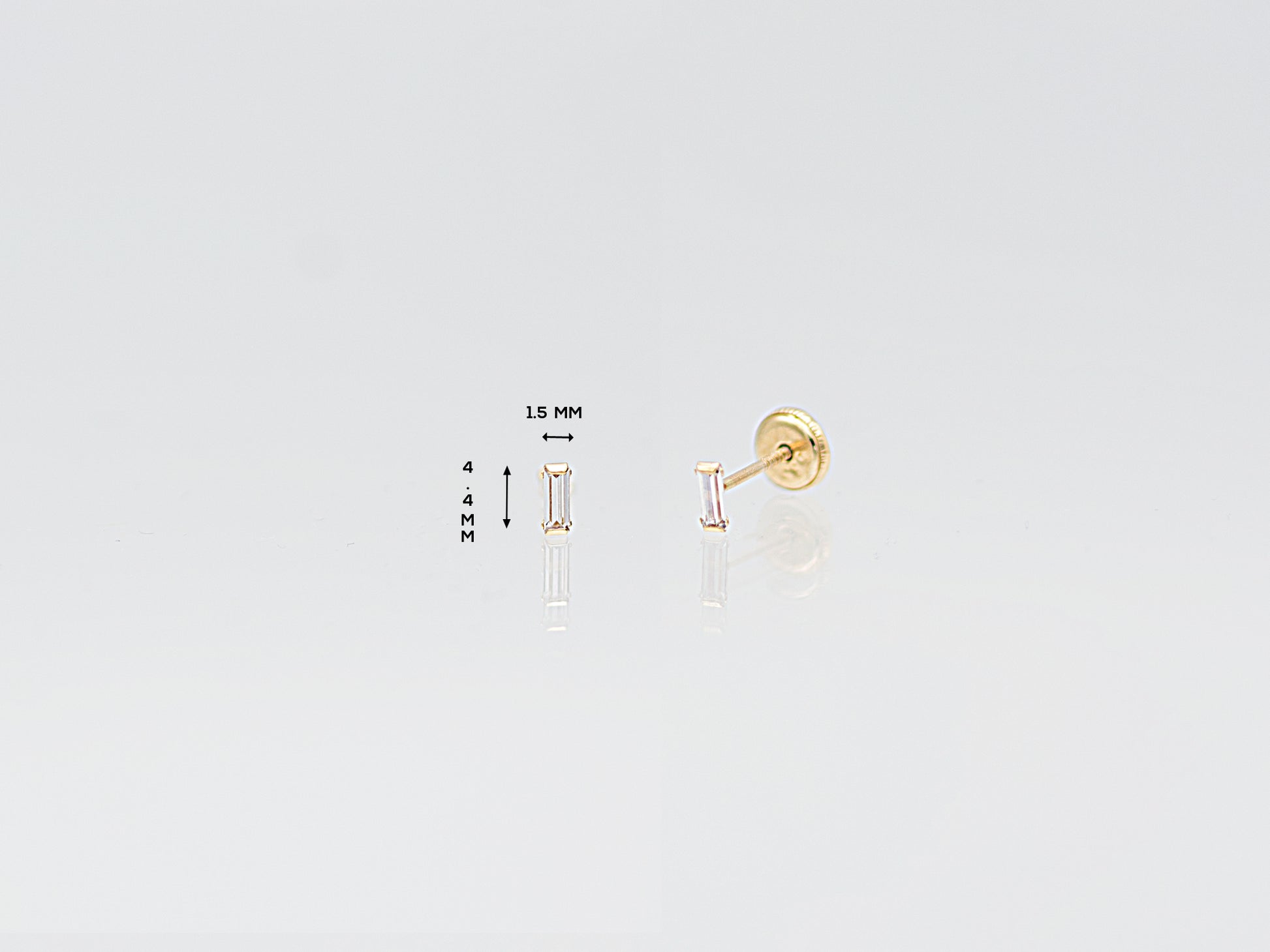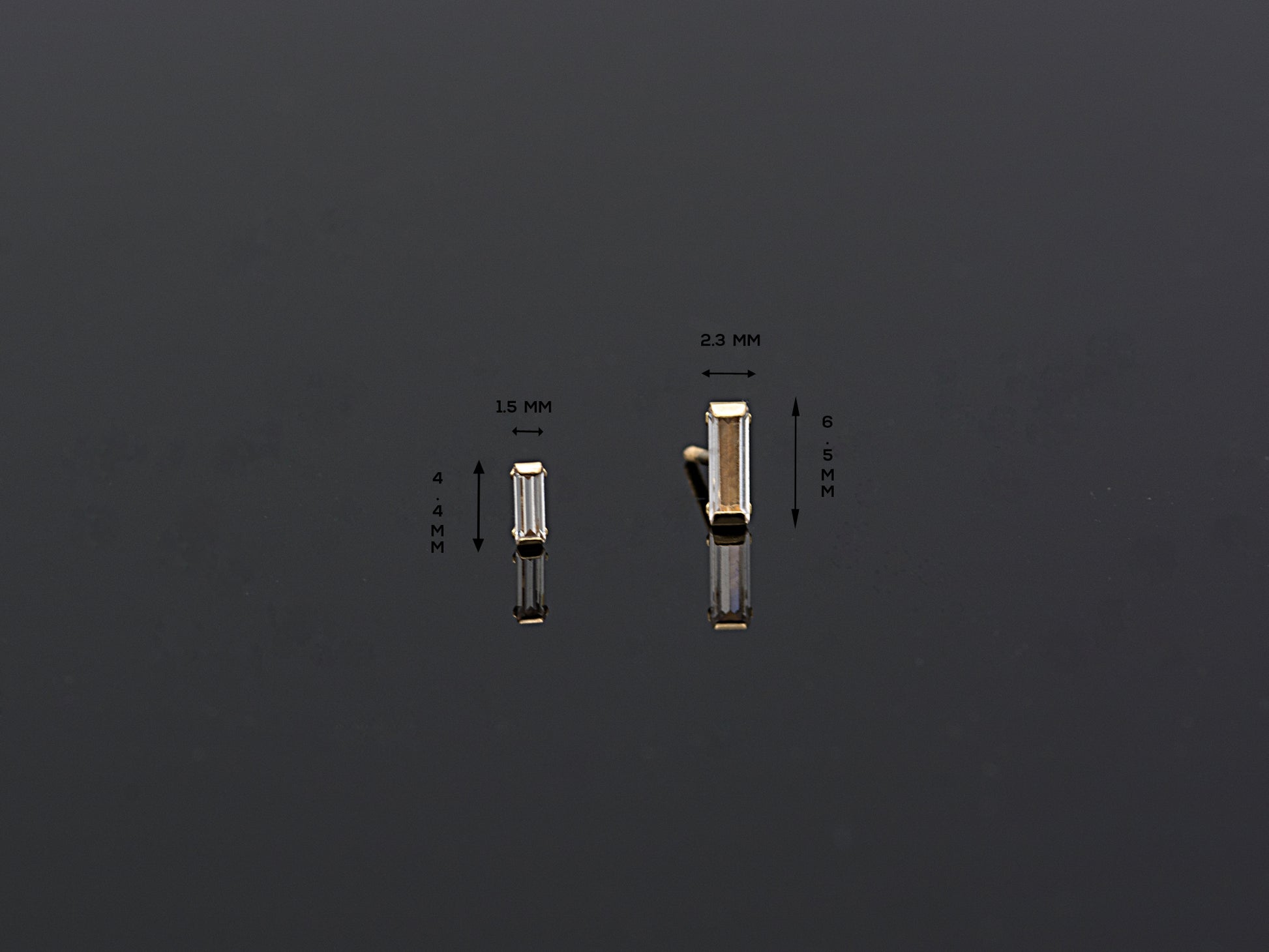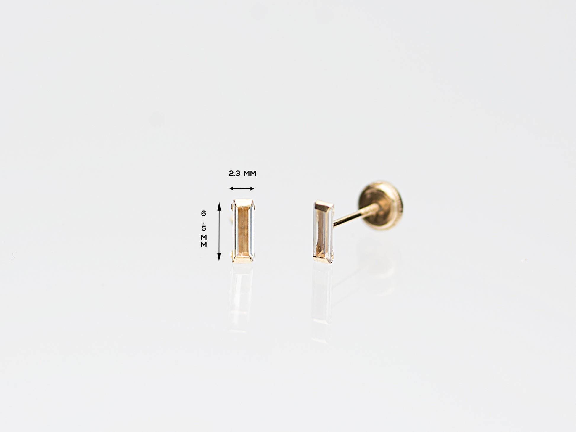 Minimalist gold bar studs with simulated emerald cut diamond that are perfect with any outfit! Wear these studs from a day at work to a night out with the girls they seriously go with everything. Their simple design makes them easy to pair with other studs if you have more than one piercing. Wear them horizontal or vertical.