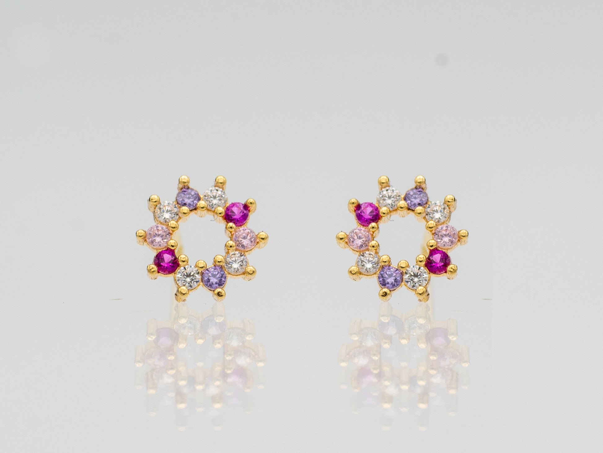 Brighten your style with these 14K solid gold simulated diamond open circle stud earrings, featuring a vibrant halo of colorful Pink gemstones. Playful yet elegant, they capture the bold energy of today’s colorful jewelry trend while adding character to any look.
