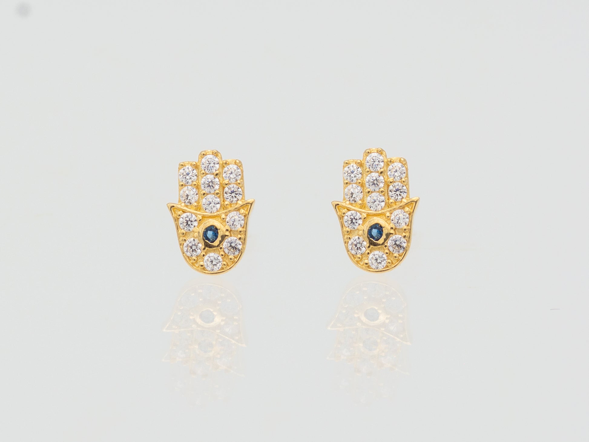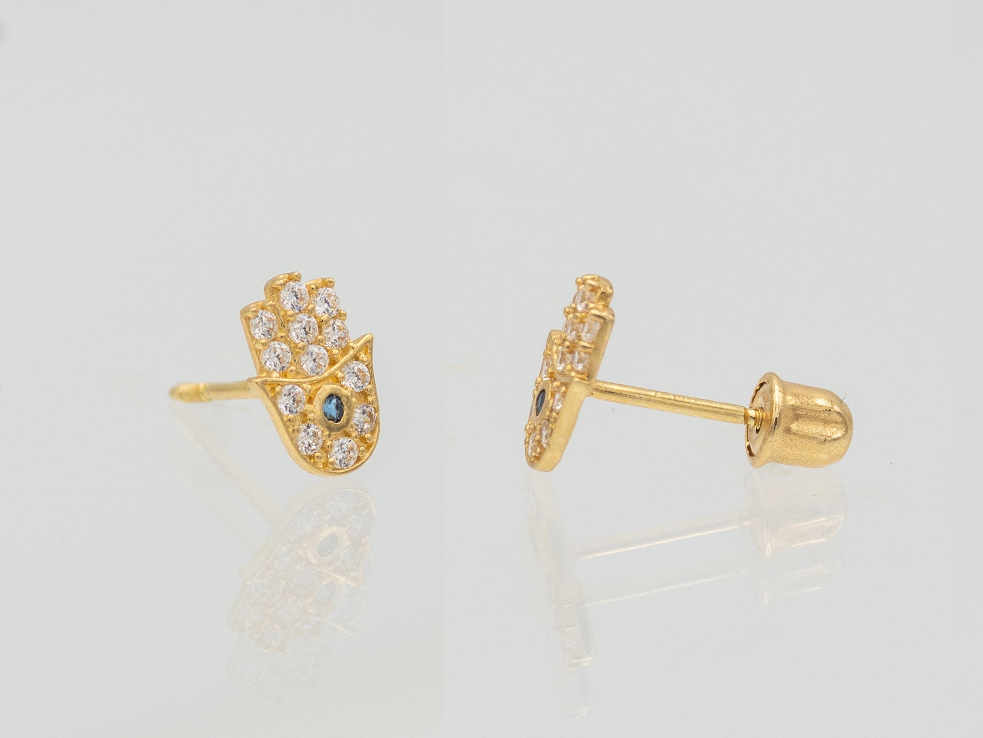 Crafted from 14k solid gold, these stylish and spiritual Hamsa hand stud earrings feature a blue simulated diamond CZ eye in the center—designed to protect against evil auras and keep bad vibes away while adding a bold touch to your look with secure screw-back comfort.