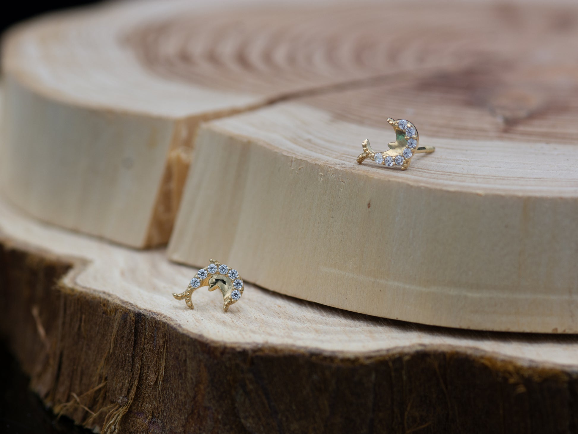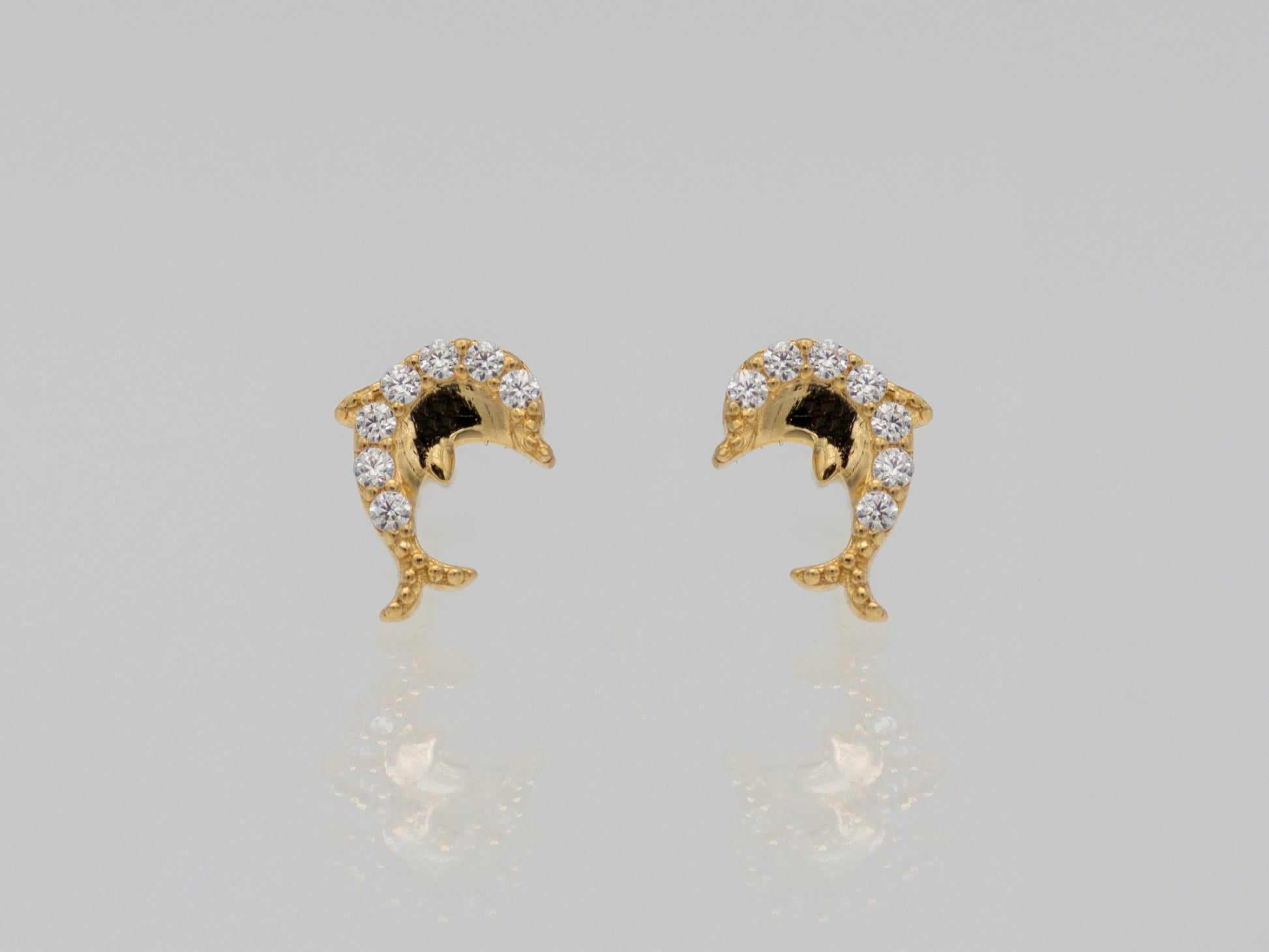 Crafted from 14k solid gold in a graceful dolphin shape, these cute and unique earrings are adorned with sparkling cubic zirconia—perfect for the ocean lover and a stunning reminder of the elegance and beauty of nature.