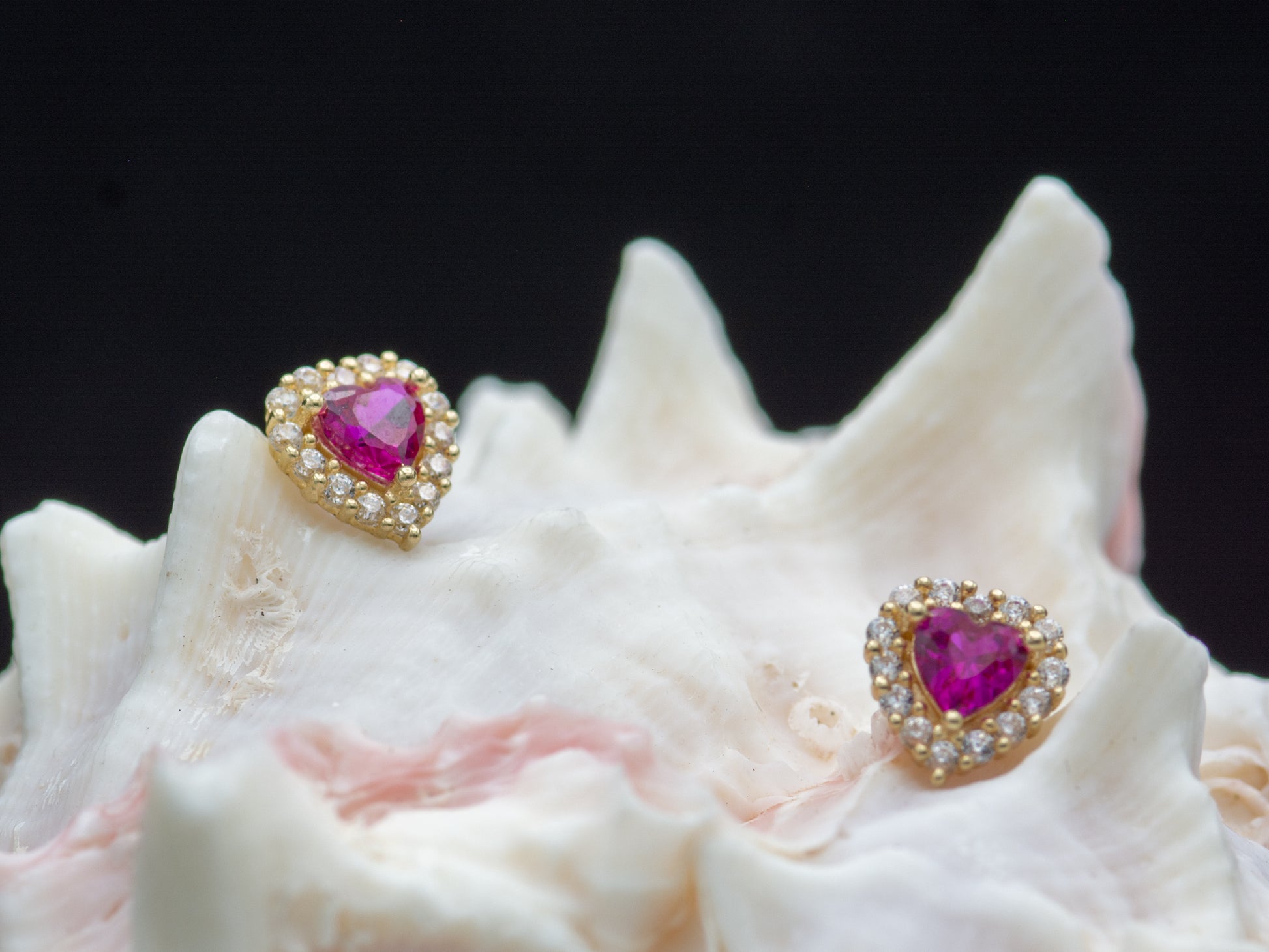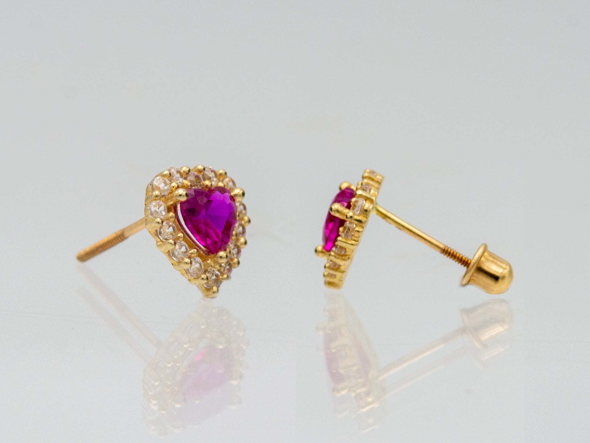 14K solid gold Heart-Shaped Synthetic Ruby and White Cubic Zirconia Frame Stud Earrings