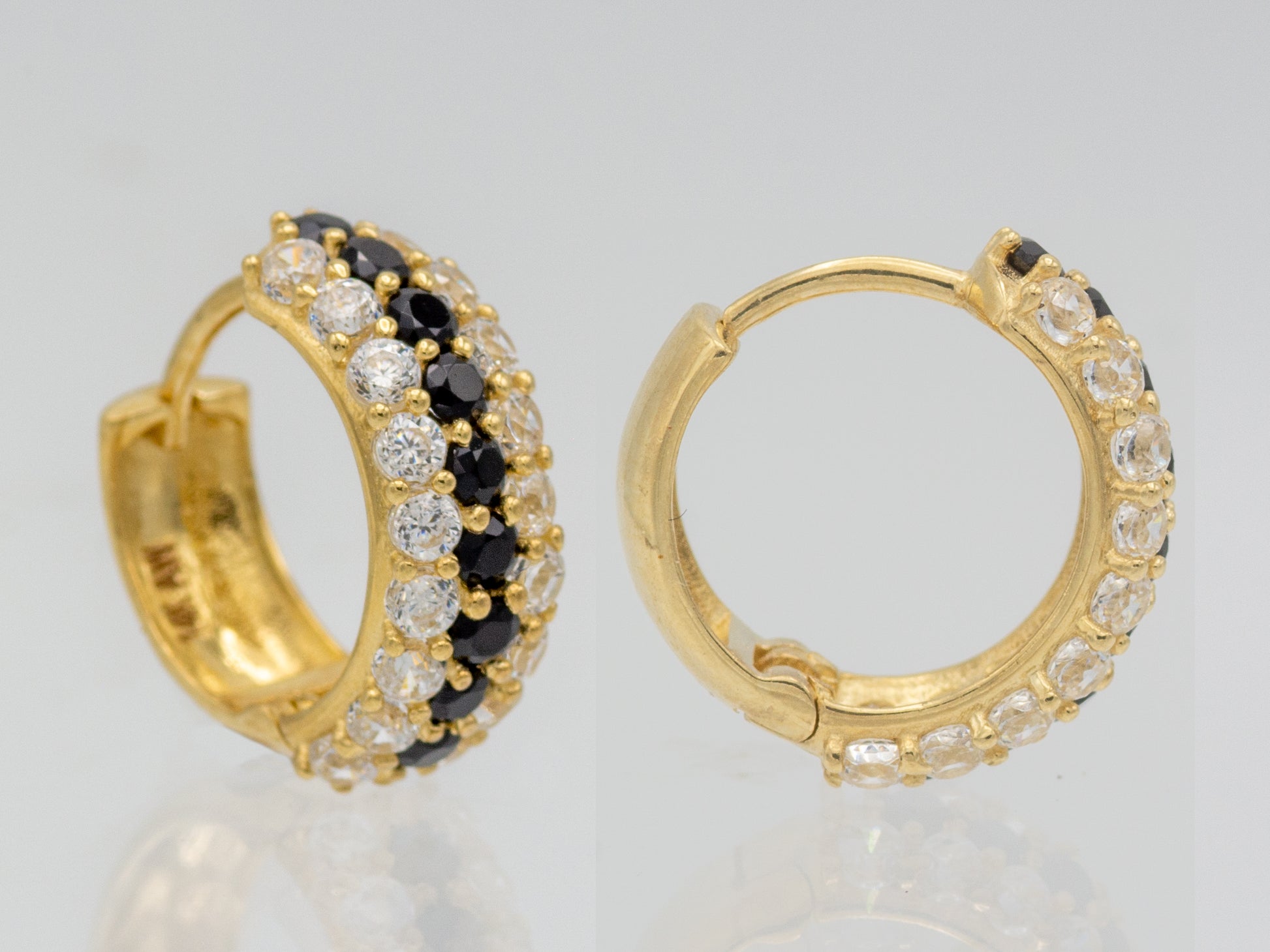 Striking, elevated, and irresistibly sparkly — these 14K Solid Gold huggie earrings feature a bold dome silhouette adorned with hand-set, high-quality zirconia. A captivating row of round-cut black stones shimmers at the center, adding depth and drama to this luxurious design. The perfect fusion of elegance and edge for your everyday or elevated looks.