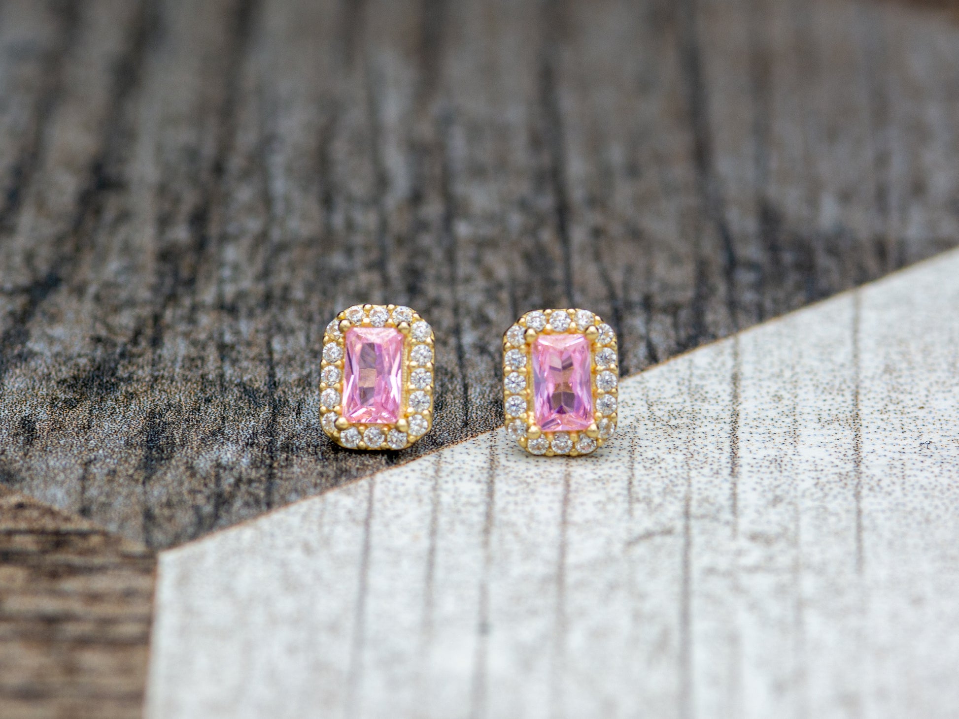 Crafted from 14k solid gold, these modern and dainty emerald-cut pink cubic zirconia square stud earrings shine with clear, sparkling brilliance—making them a lovely gift for Valentine’s Day, birthdays, or any special occasion.