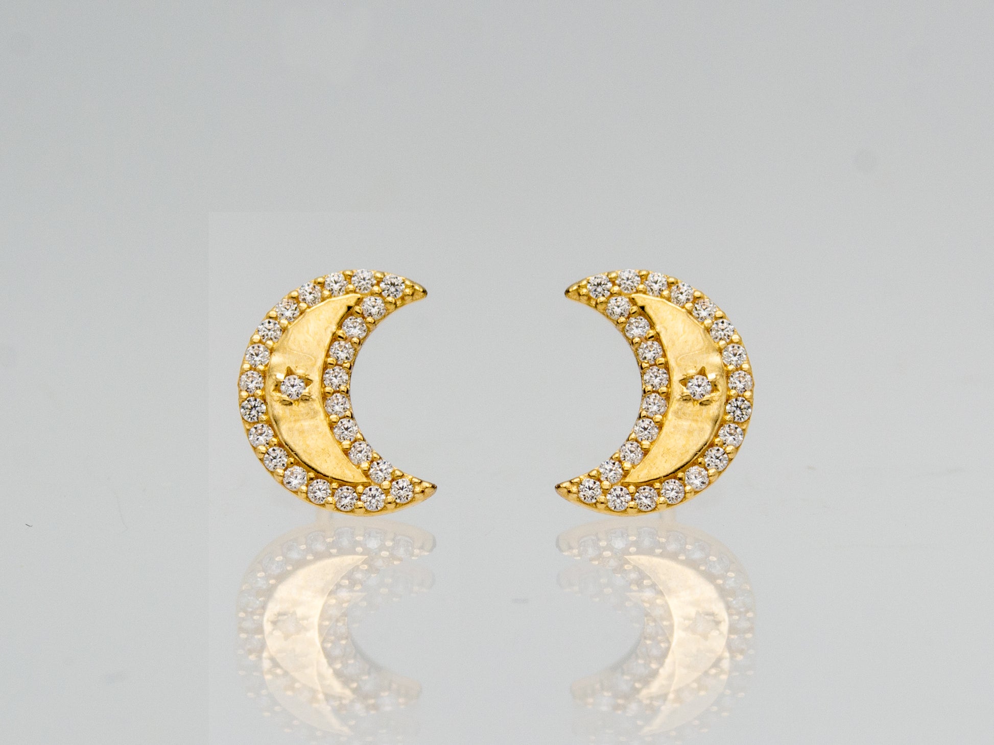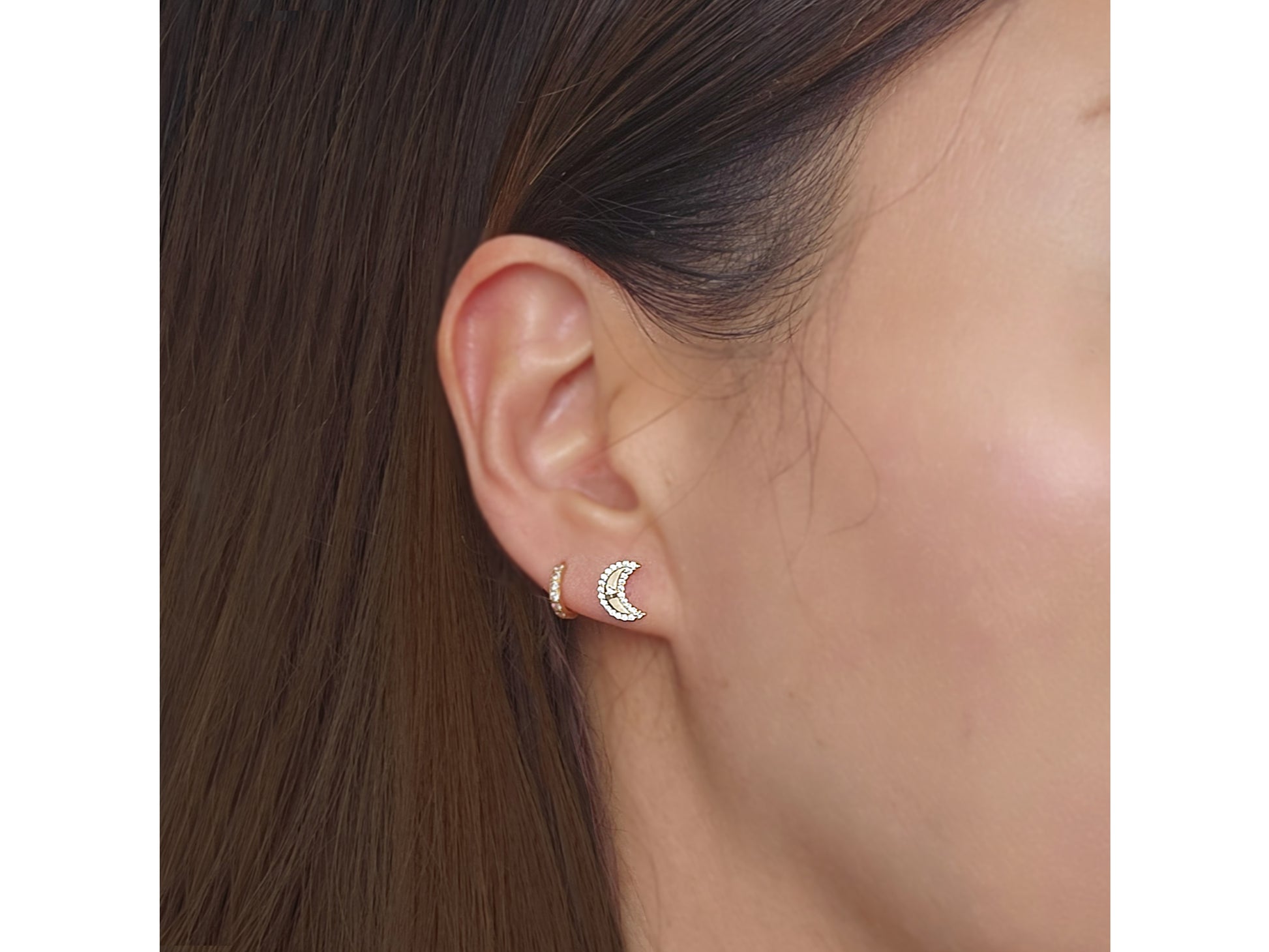 14K Solid Gold Simulated Diamond Crescent Moon Earrings