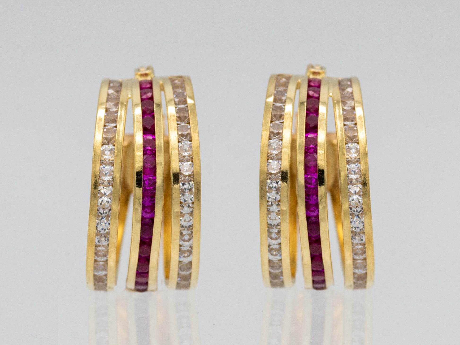 Crafted in 14K solid gold, these polished triple huggie earrings feature dazzling simulated rubies and diamonds for a bold, statement-making look. Whether you're dressing up for a special event or elevating your everyday style, these hoops are the perfect choice for the modern, fashion-savvy woman.