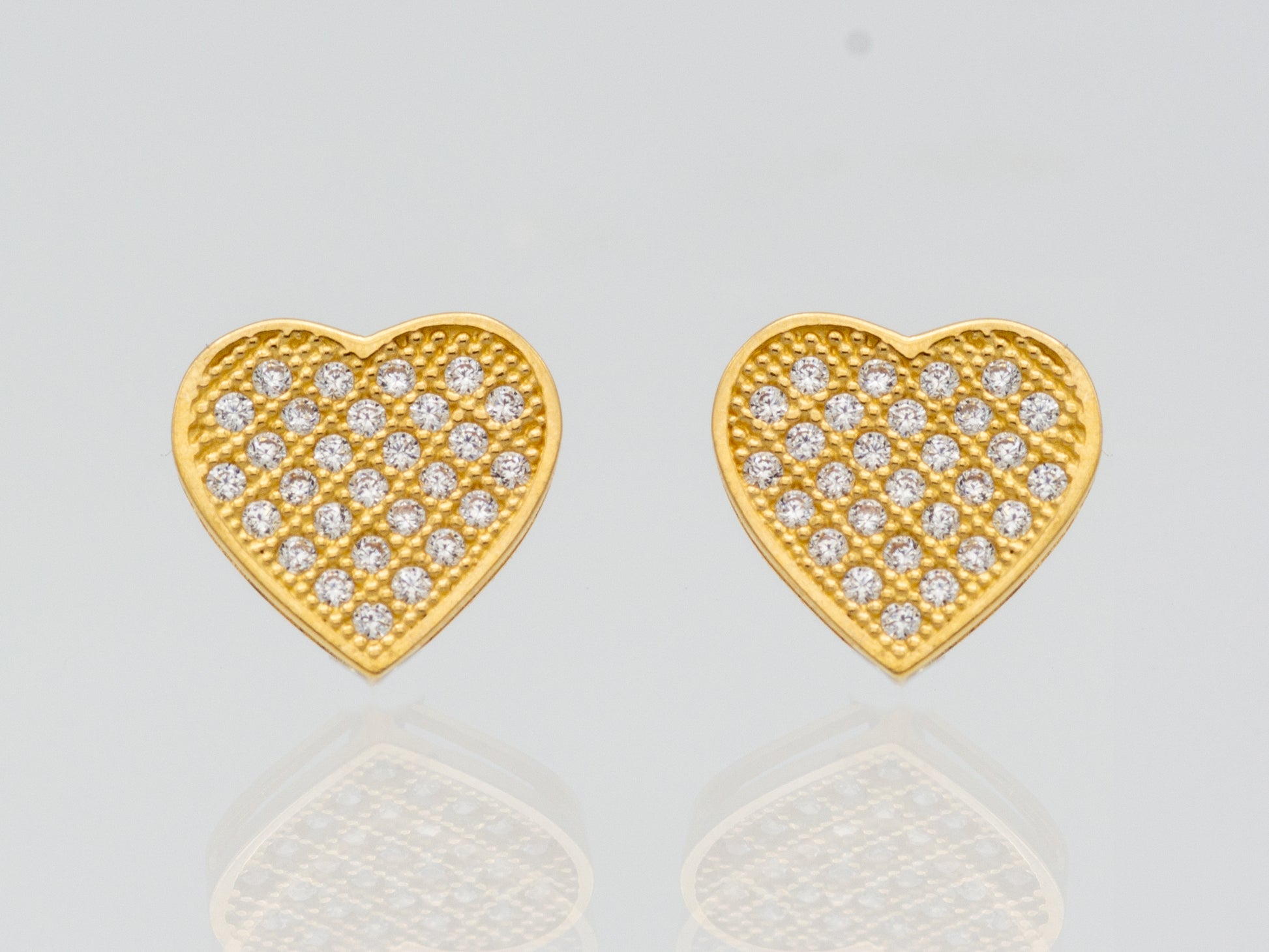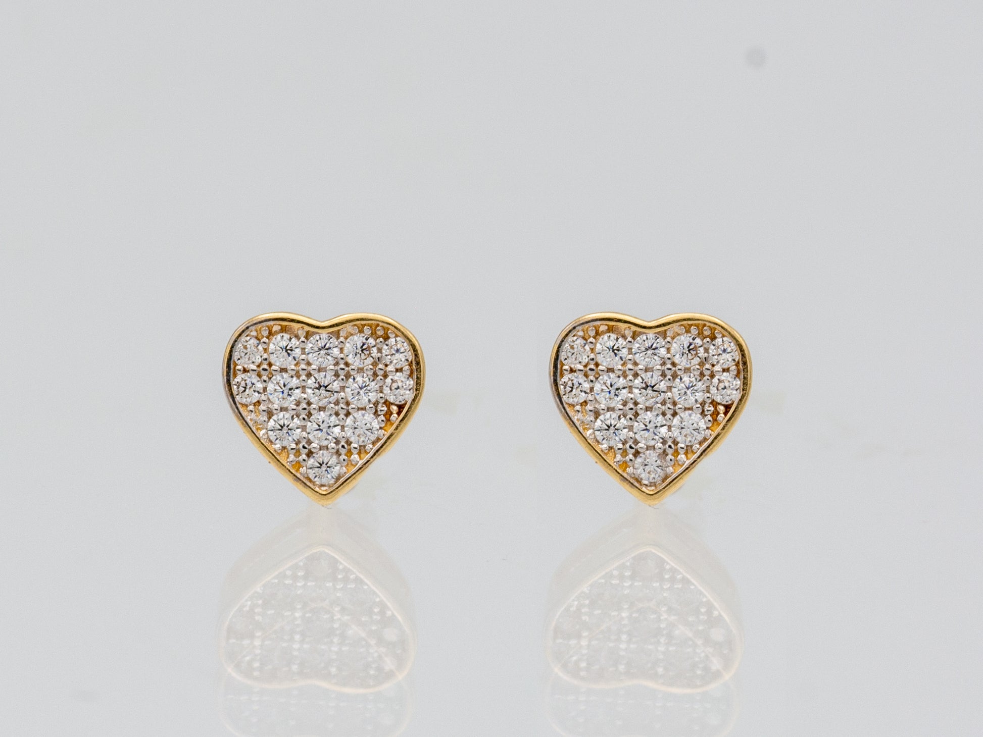 Celebrate love and sparkle with these 14K Yellow Solid Gold Pave Heart CZ Stud Earrings. Brilliant round simulated diamonds surround elegant heart-shaped settings, creating a timeless and sentimental design. Perfect for everyday wear or gifting someone special, these earrings are a radiant symbol of affection and elegance.