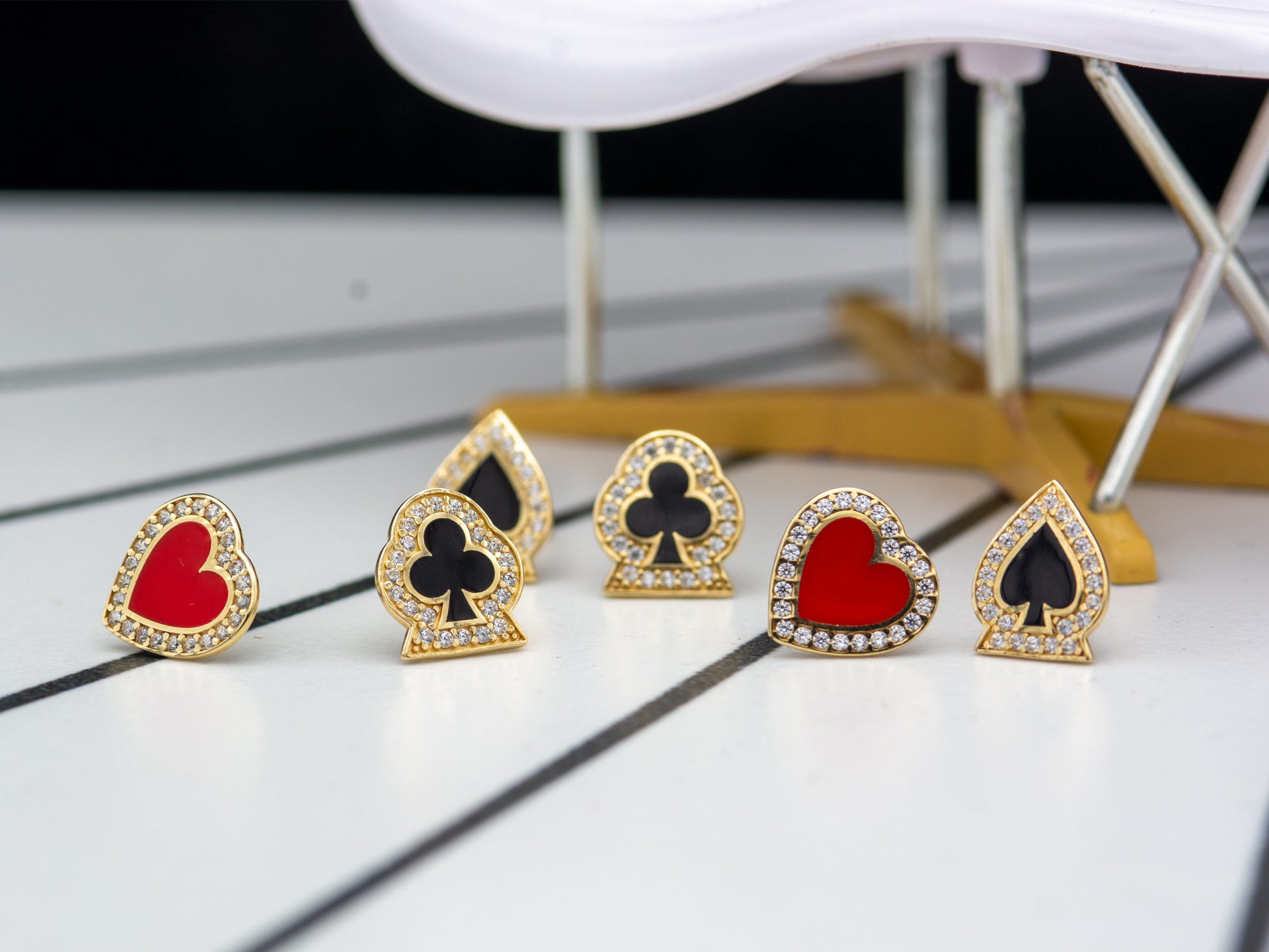 Crafted with a minimalist touch, these delicate 14K solid gold poker stud earrings feature four iconic designs—spades, hearts, and clubs—offering a playful yet elegant way to express your unique style.
