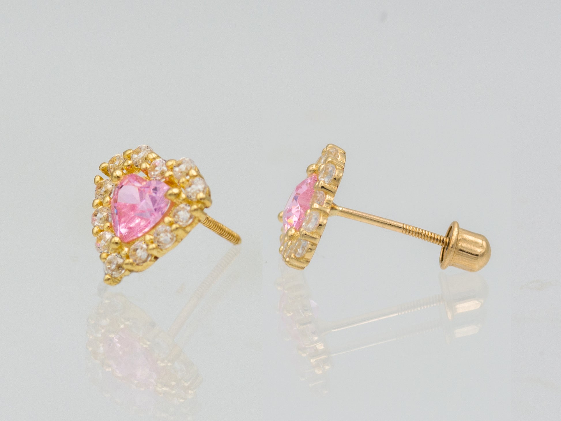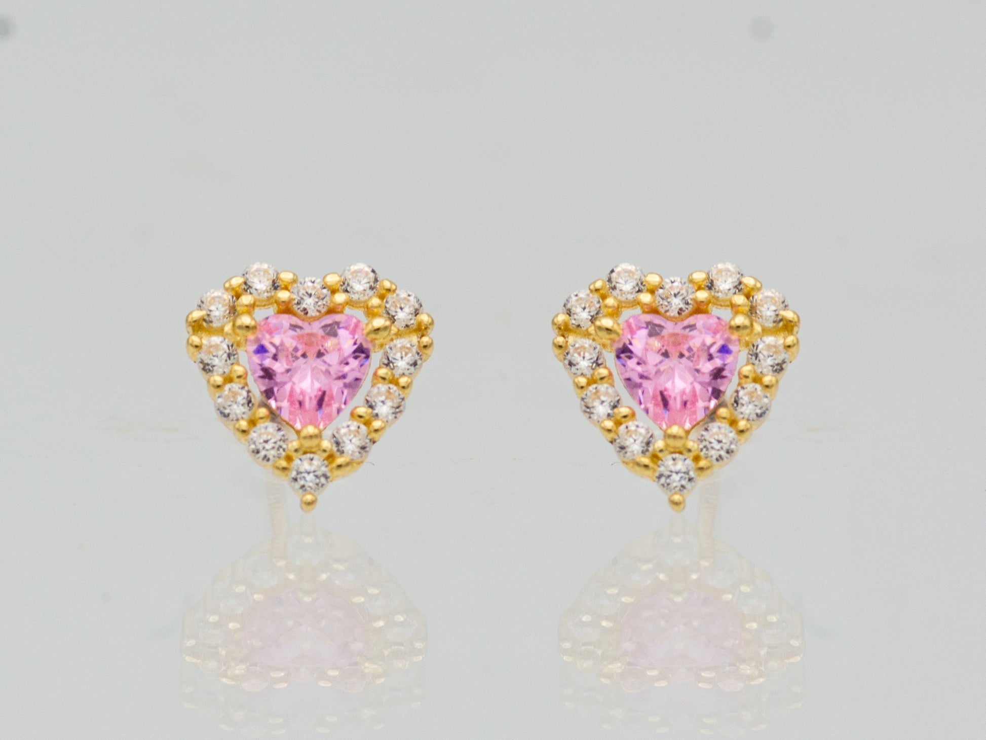 Crafted from 14k solid gold, these heart stud earrings feature a vibrant pink heart-shaped cubic zirconia at the center, beautifully framed by a halo of shimmering white stones. The warm glow of yellow gold enhances the playful yet elegant design, making them a sparkling and delightful choice for everyday wear or a meaningful gift.