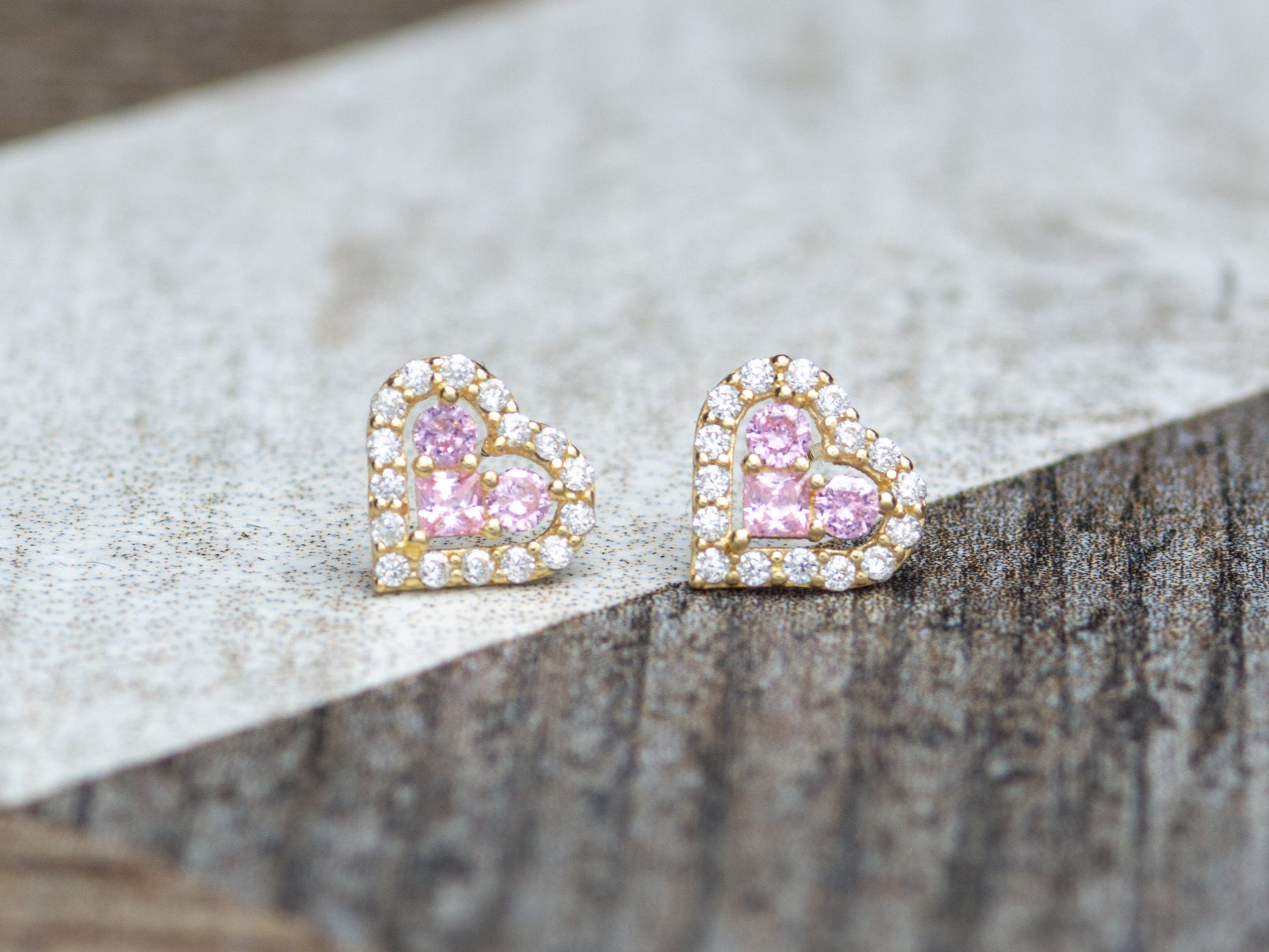 14k solid gold Pink and White Cubic Zirconia Frame Heart Stud Earring