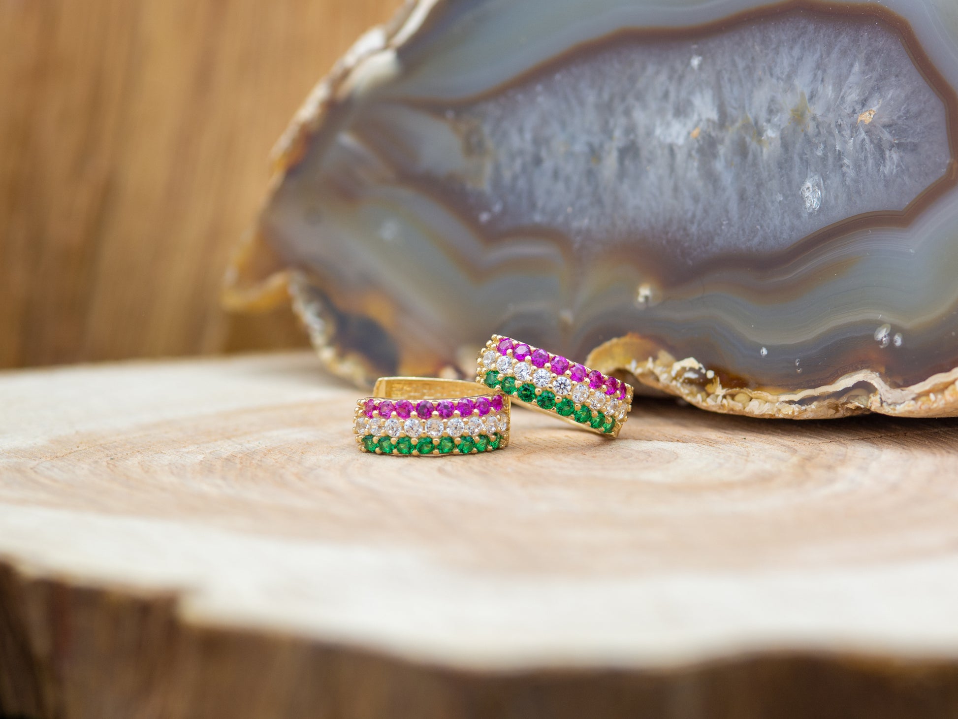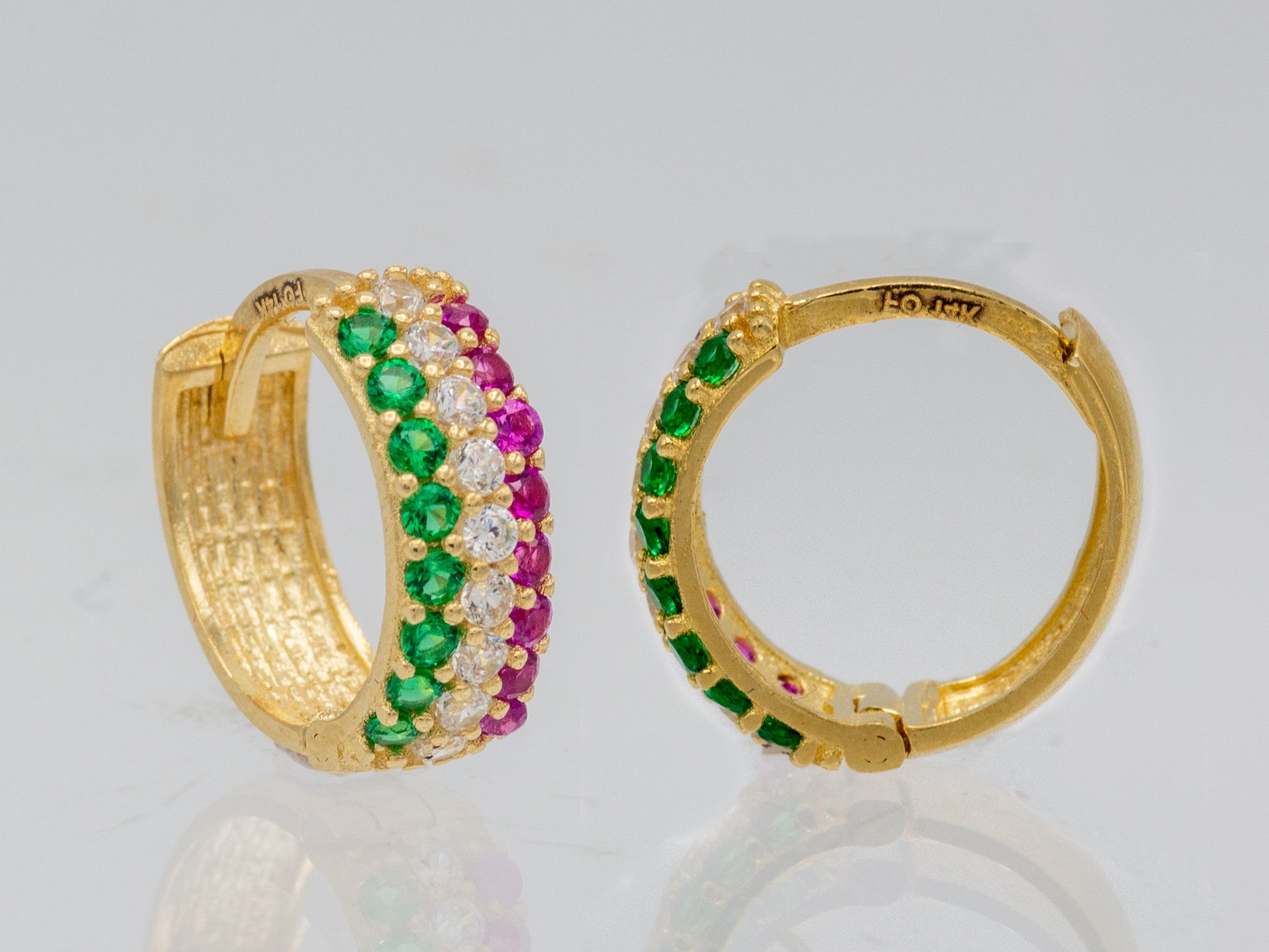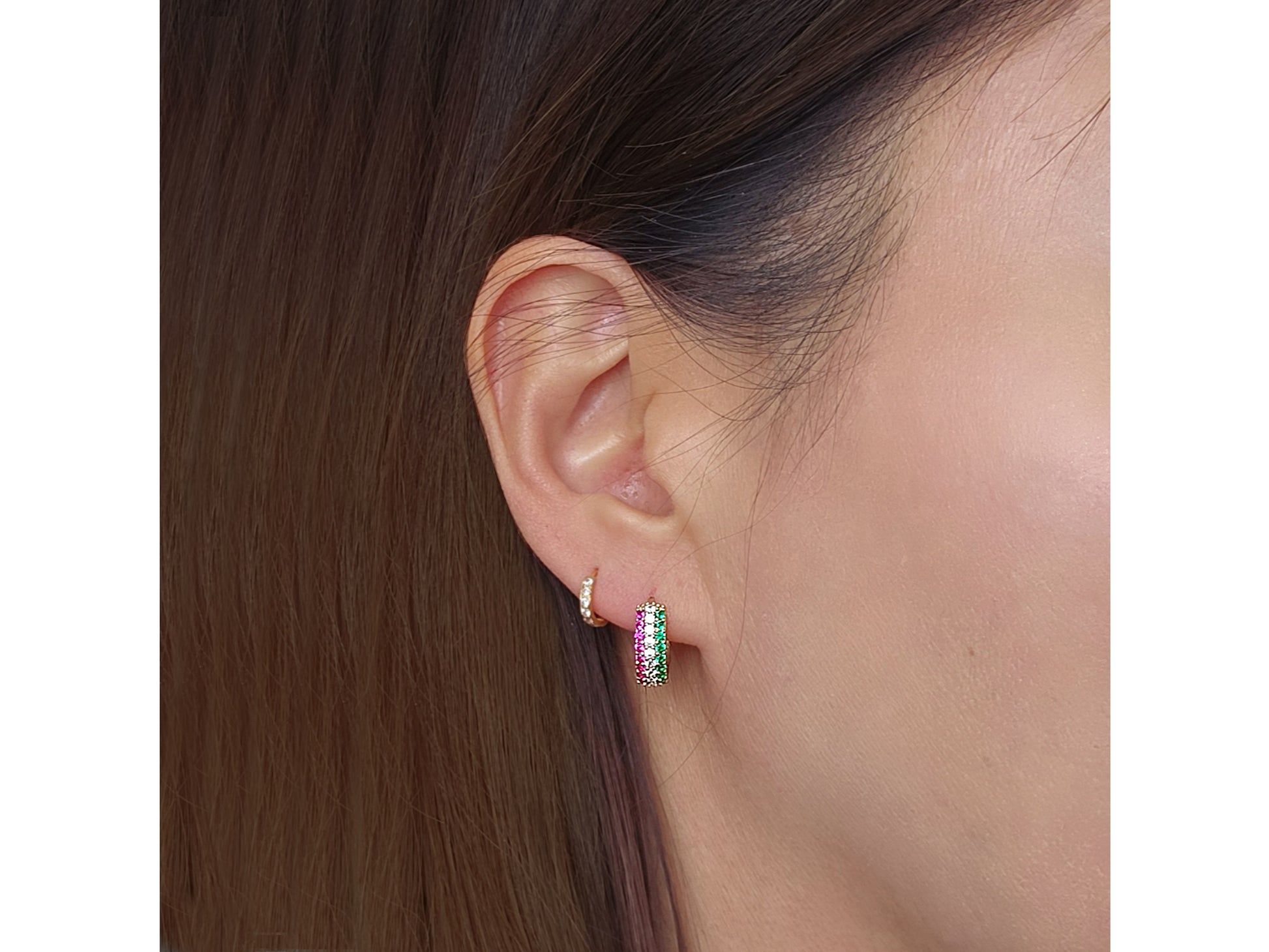 Crafted in 14K solid gold, these stunning huggie earrings showcase a vibrant mix of simulated ruby, emerald, and diamond stones. Elegant and versatile, they’re perfect for stacking, mixing and matching, or wearing solo for a timeless, sophisticated look.