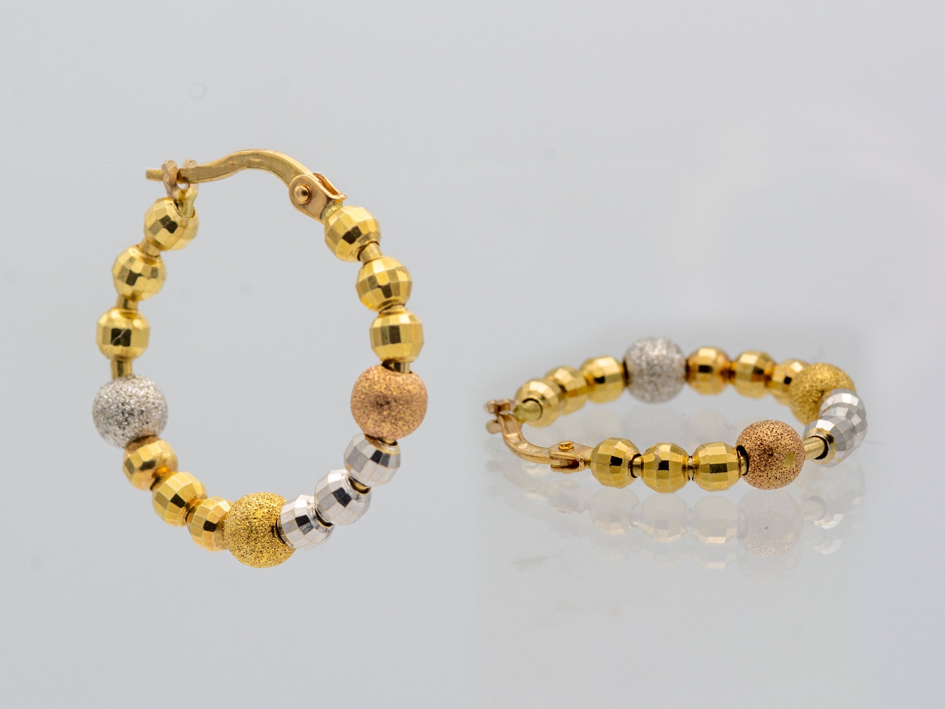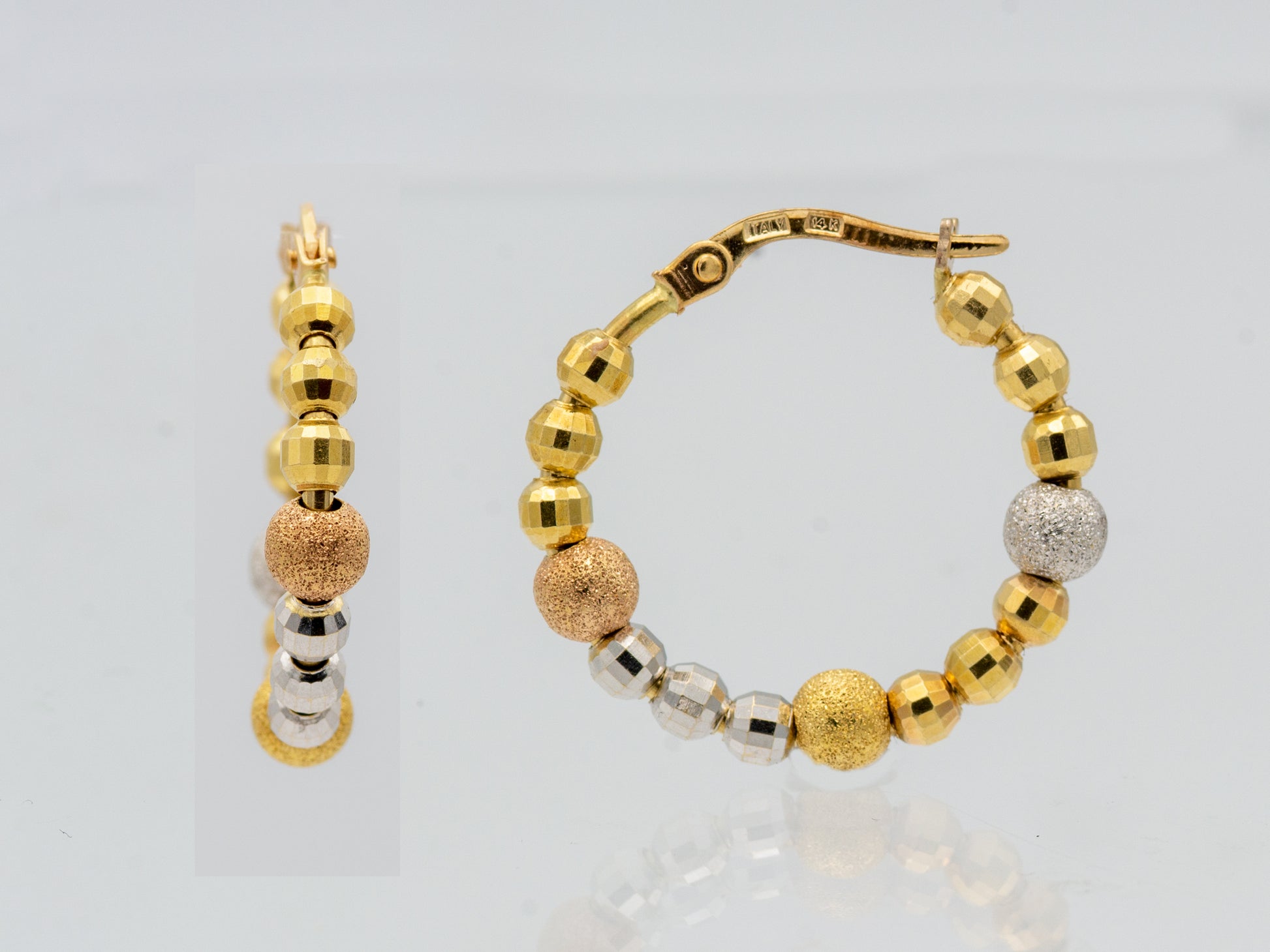 Crafted to last a lifetime, these 14K solid yellow gold hoops shimmer with the radiant allure of white, yellow, and rose gold beads. Secured with a hinged back closure, they bring timeless elegance and a chic touch to any outfit.