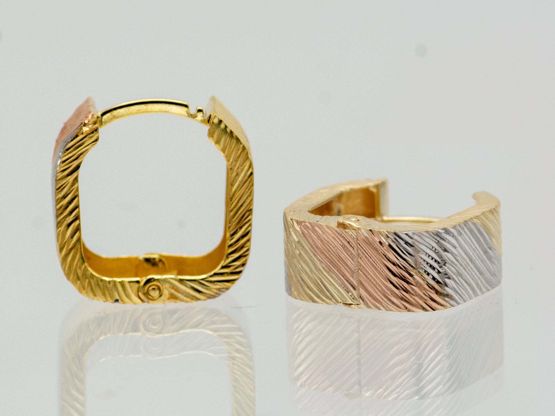 14K Solid Gold Stripe Diamond Cut Tri color Square Chunky Huggies Hoop earring