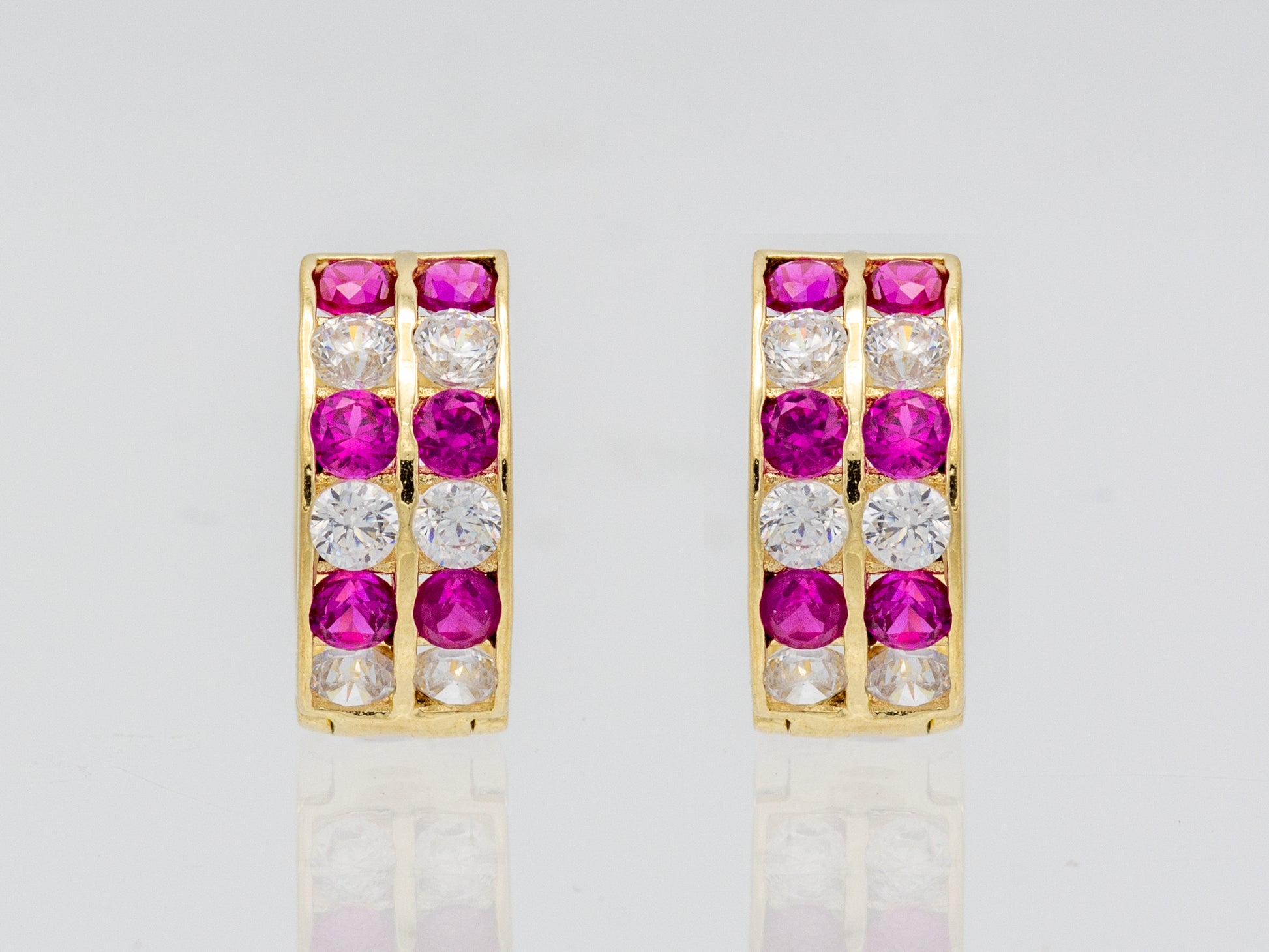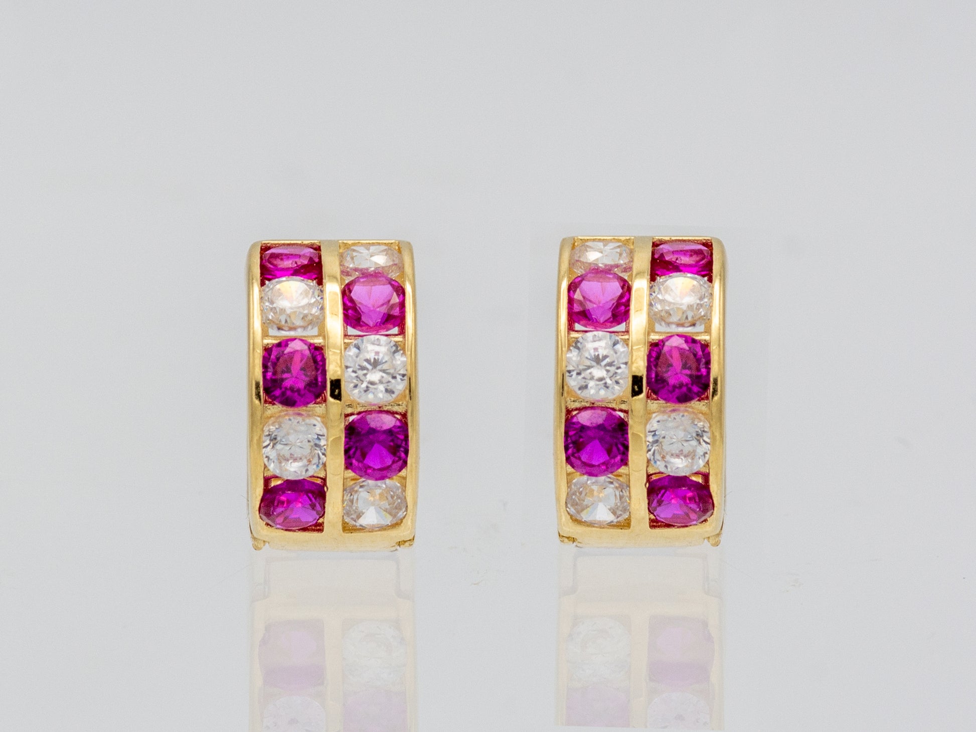 Make a bold statement with these stunning 14K solid gold huggie earrings, featuring a captivating blend of vibrant red and shimmering white cubic zirconia gemstones. Expertly crafted to enhance the brilliance of each stone, their radiant design brings effortless elegance to both everyday wear and special occasions. A must-have piece that adds timeless charm and sophistication to any jewelry collection.