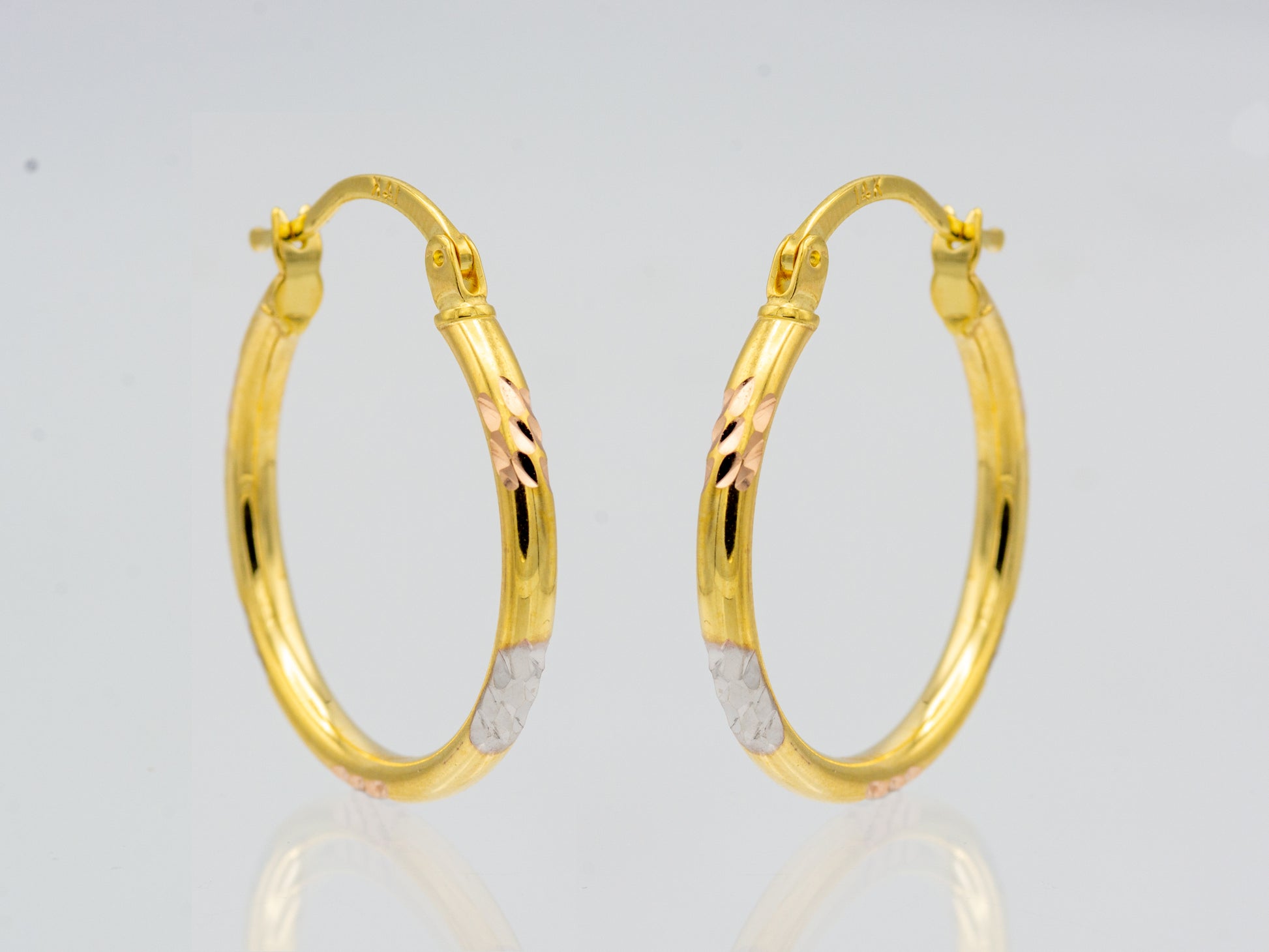 14K Solid Gold Round Diamond Cut Tri Color Fancy Hoop Earrings