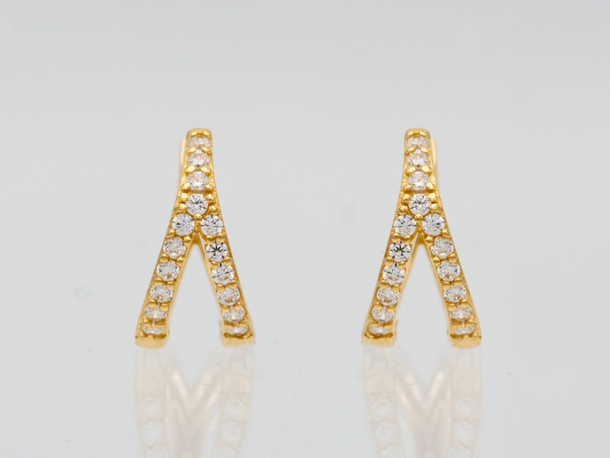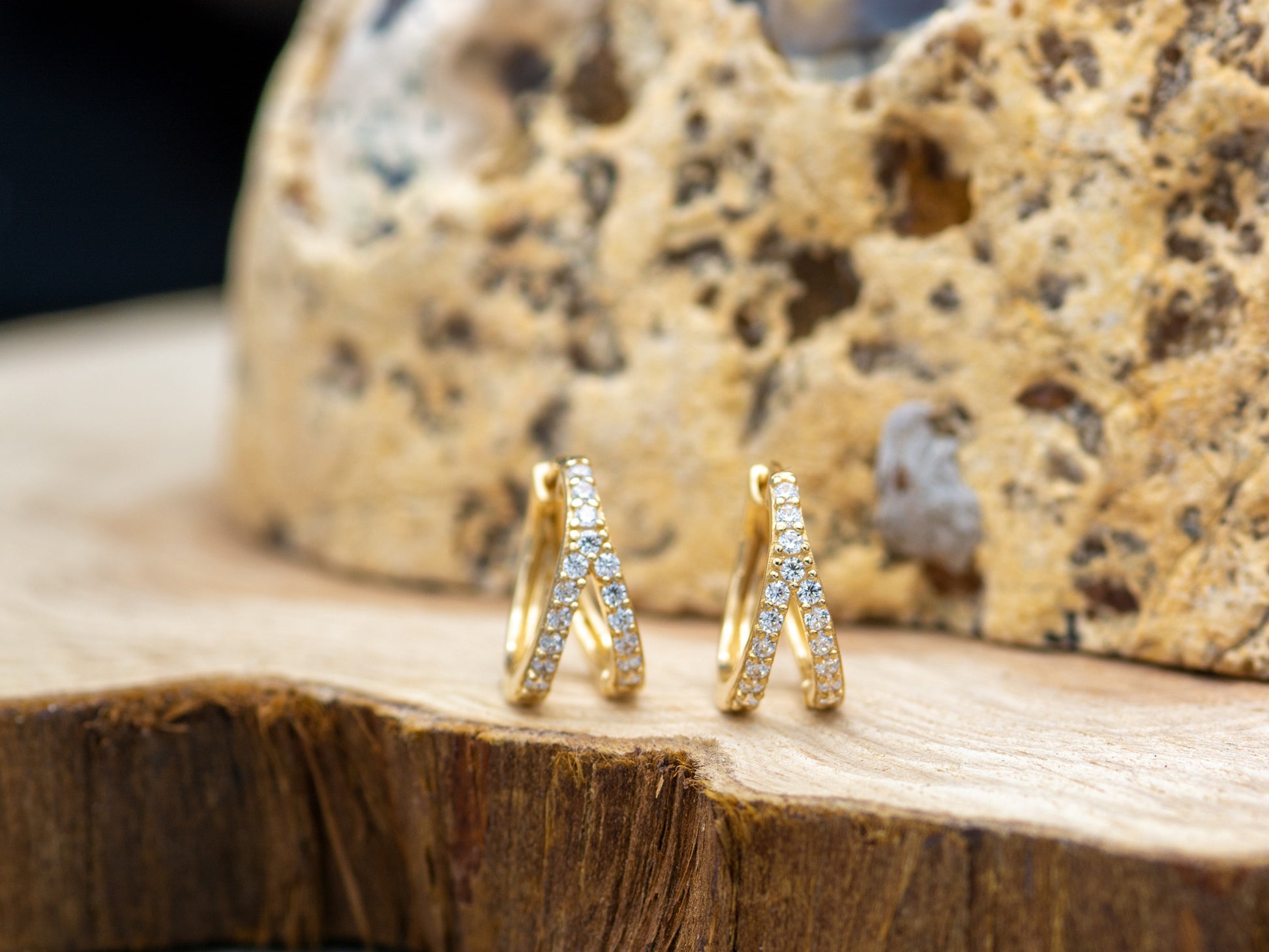 A favorite classic reimagined — these 14K Yellow Gold 'V' Split Huggie Hoops bring a chic, modern twist to timeless elegance. Adorned with white simulated brilliant-cut diamonds along the front, their sleek split design offers just the right amount of sparkle. Minimalist yet striking, they're the perfect way to elevate your everyday style and a must-have for any jewelry collection.