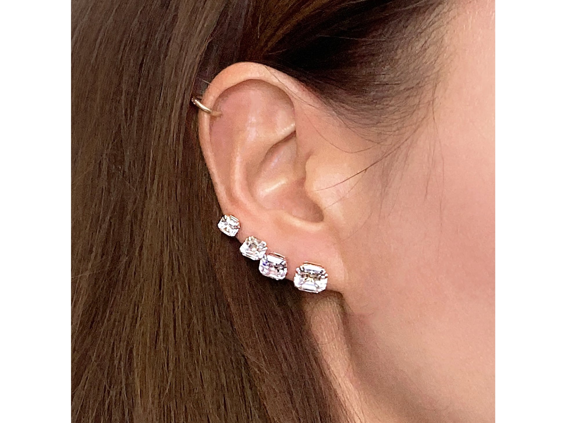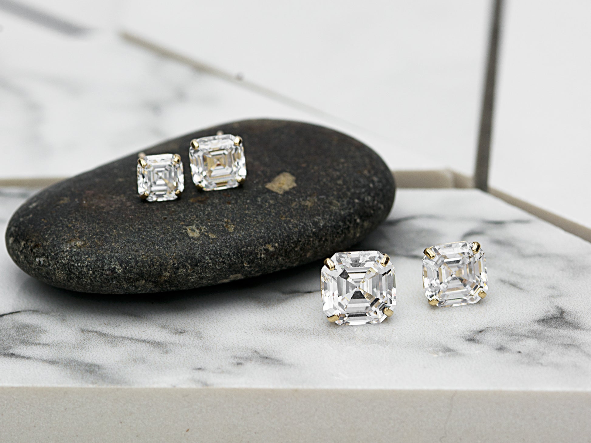 14K solid yellow gold basket setting with Asscher cut CZ post stud earring.