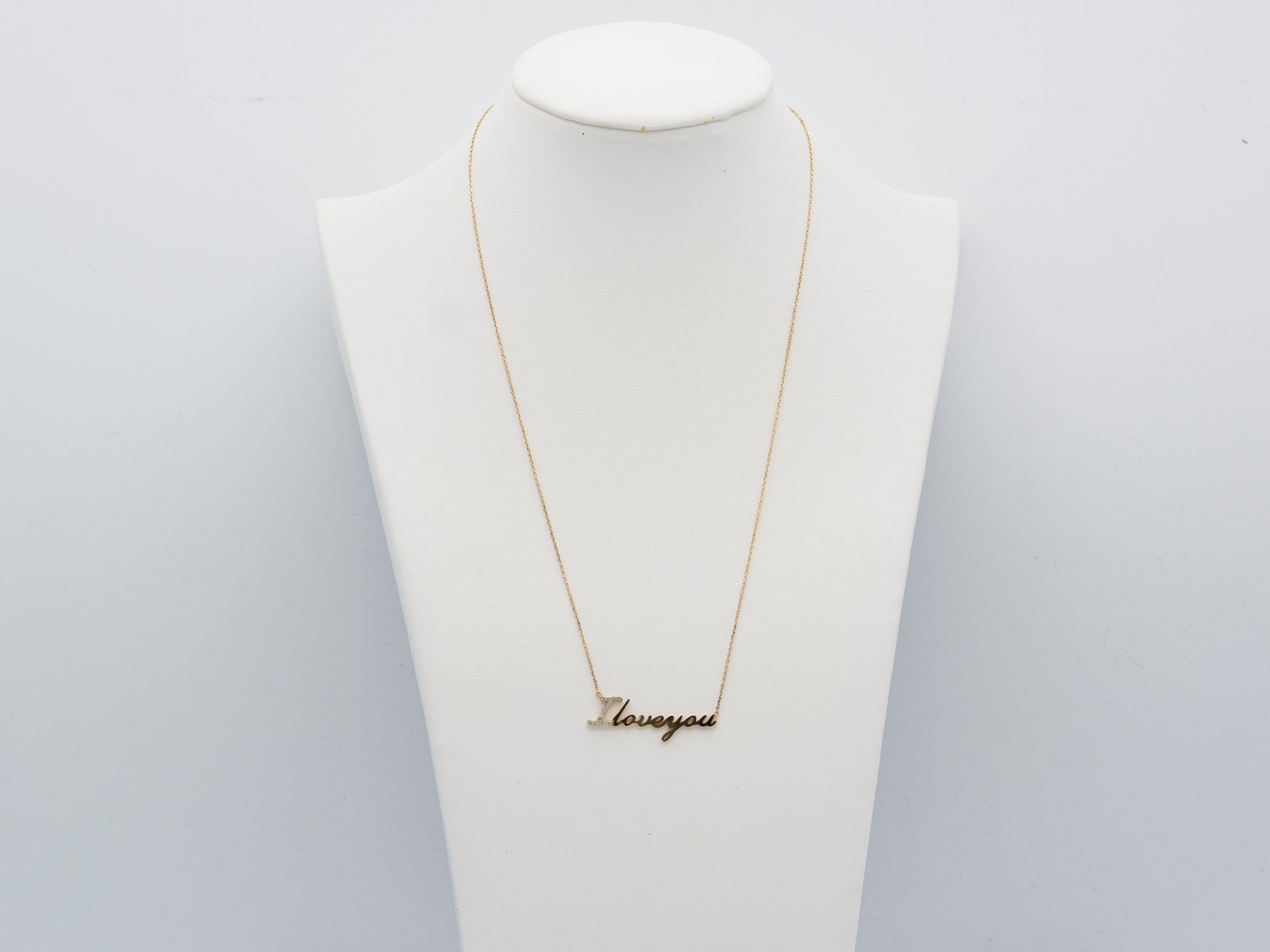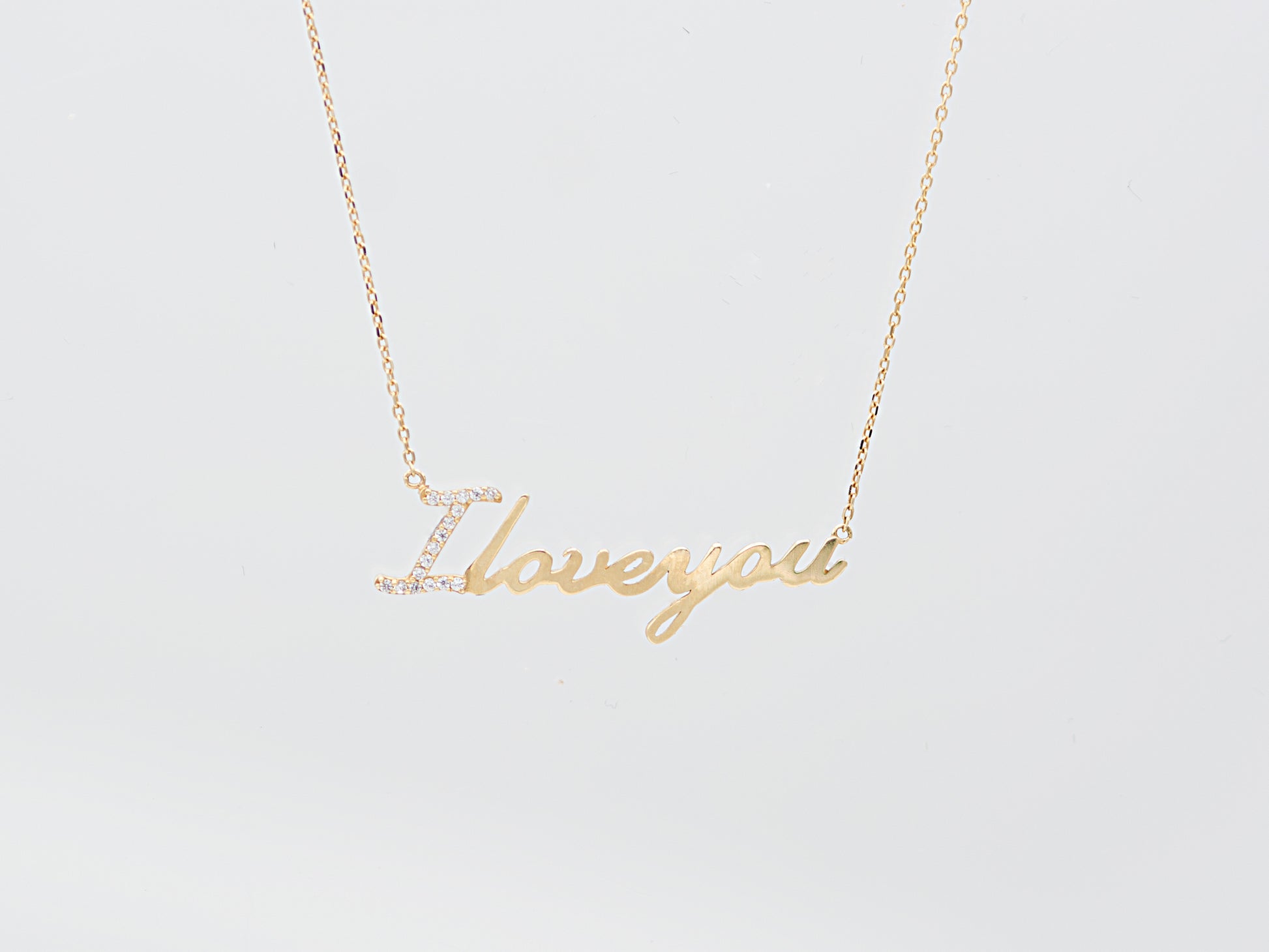 14K Solid Yellow Gold " I Love you" script Letter necklace with simulated Diamond