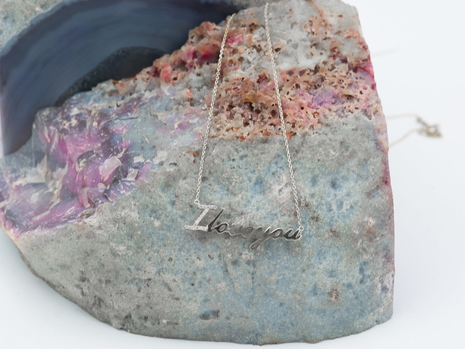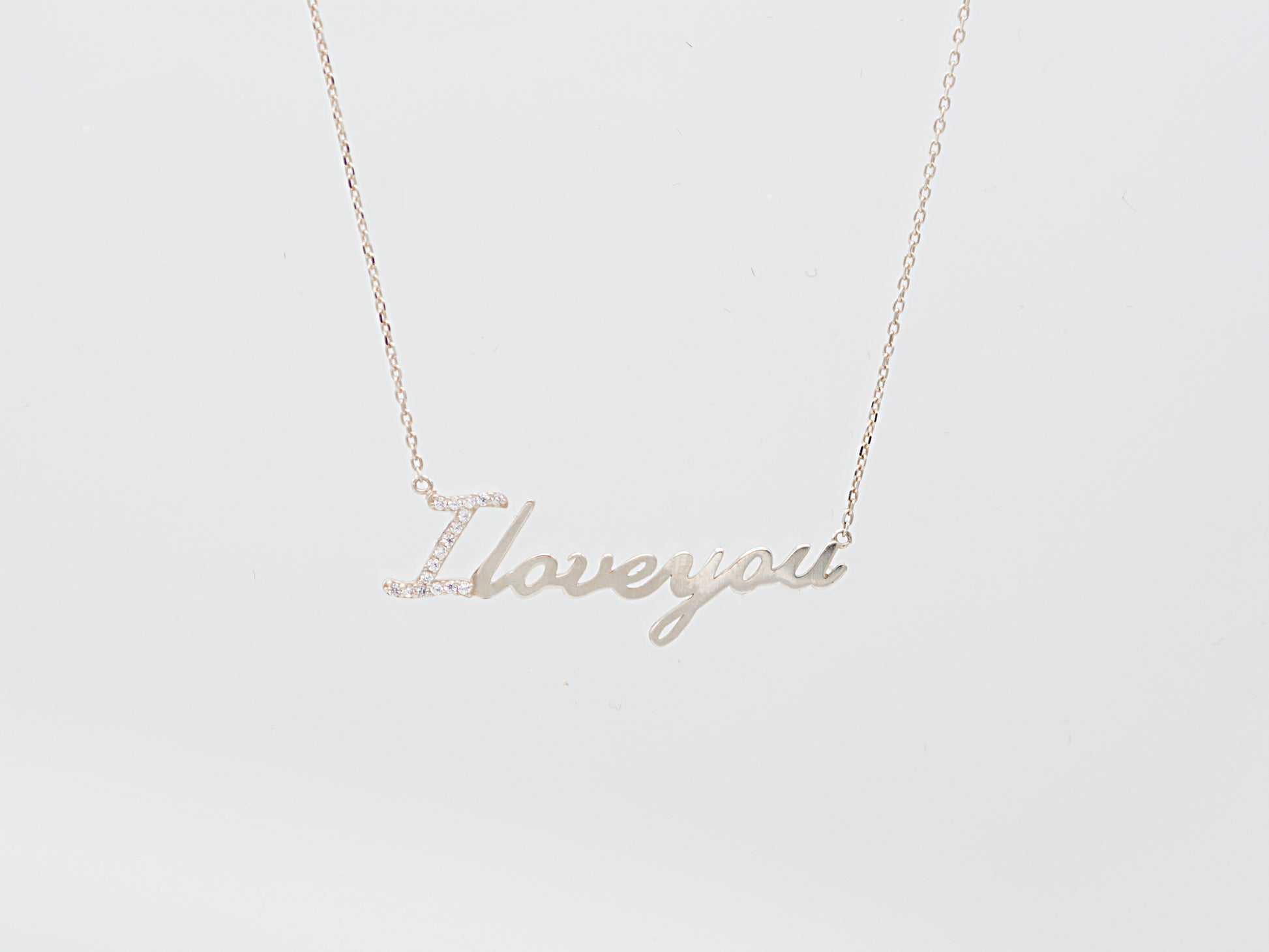 The phrase "I love you " hangs gracefully in this meaningful women's necklace.
