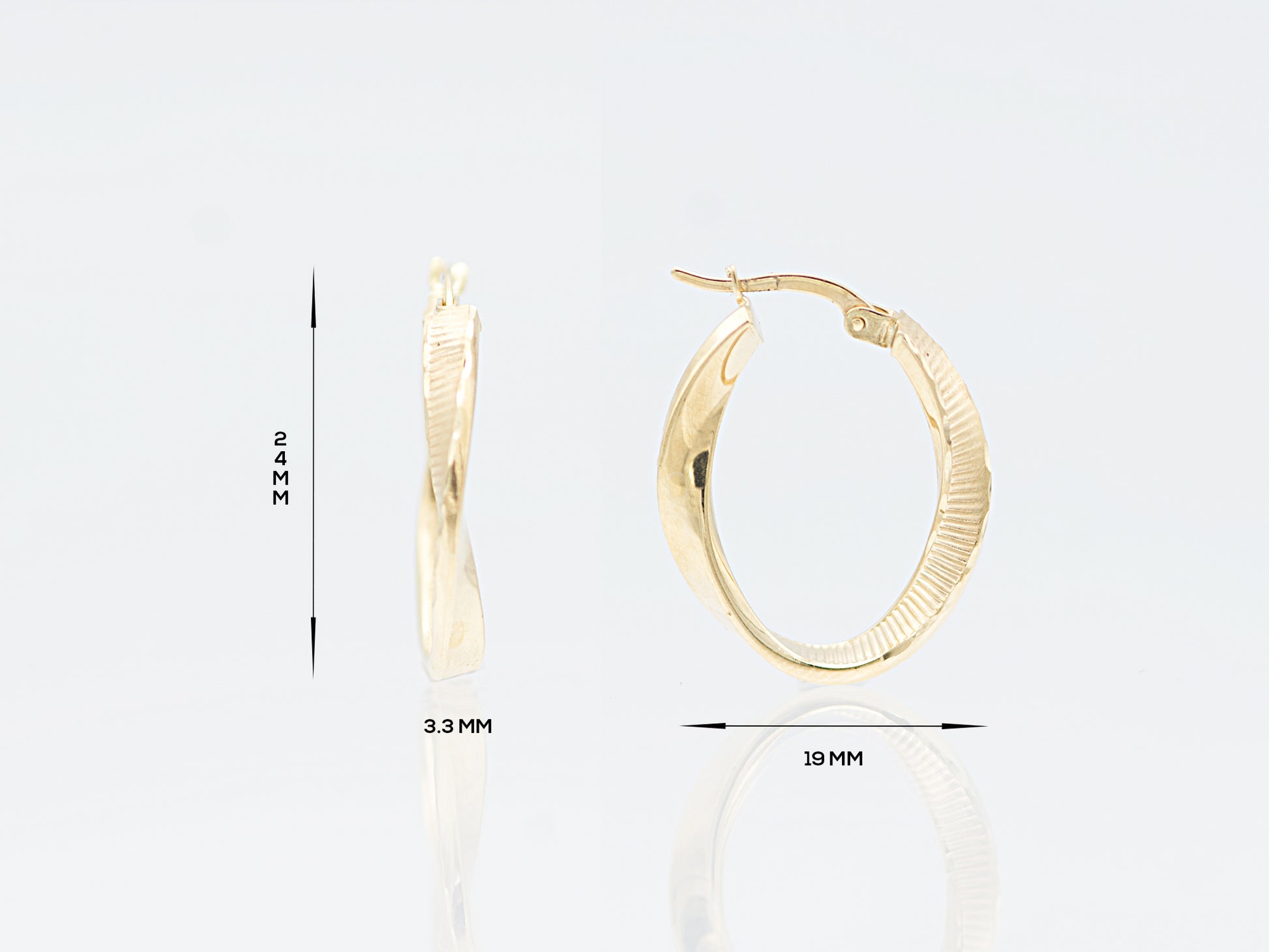 14K Solid Yellow Gold Oval Hoop Earrings, Twisted Flat Tubing lined Textured Finish earing, Hand Polished wave Hoop, Trendy Gift for her.