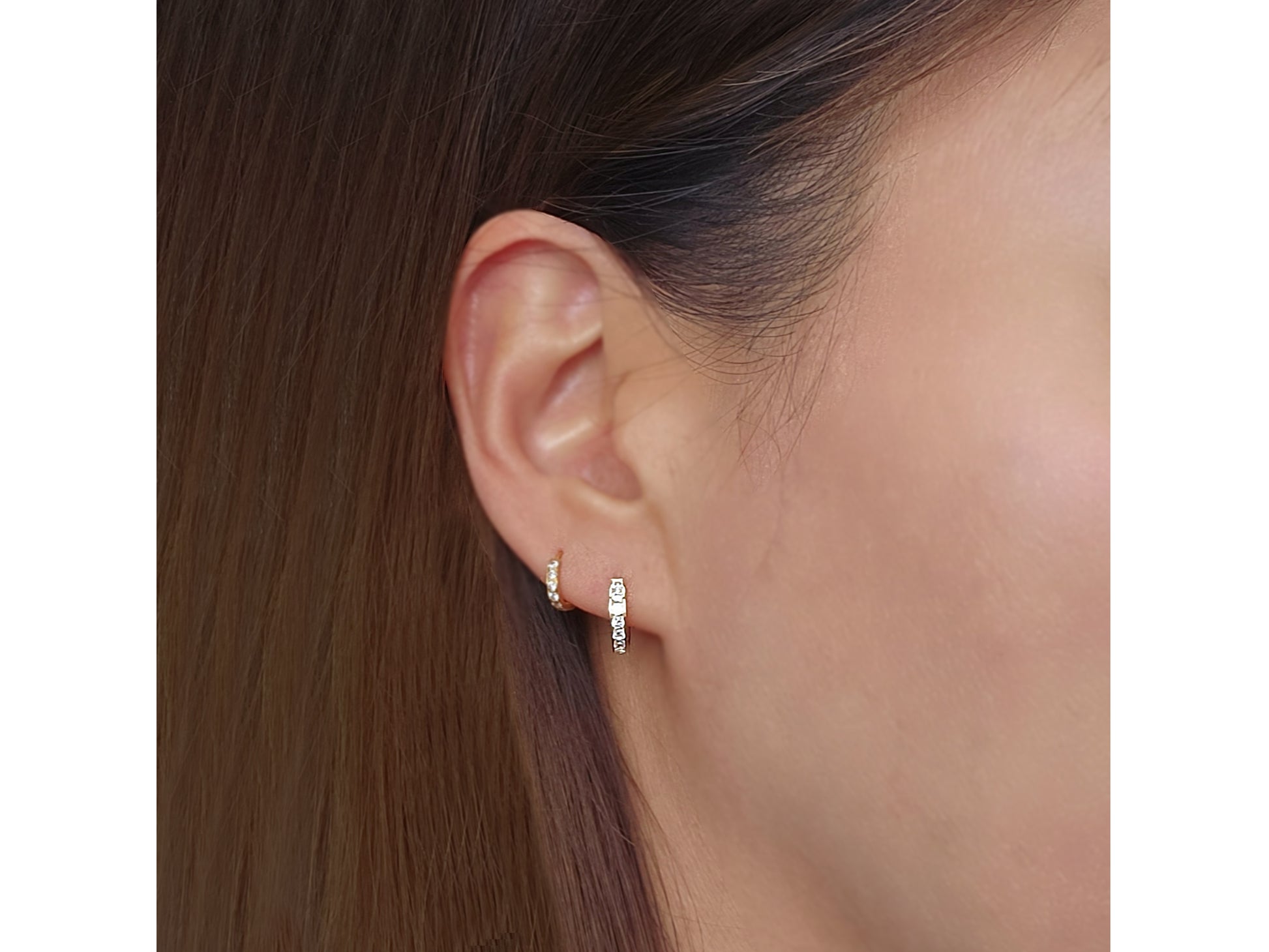 Simple, edge and brilliant Huggie mini hoop earring is single line channeled setting will give a crisp and clean look that we all been looking for, dress it up for special event or just dress it down with T- shirt and a jean, will work both ways.