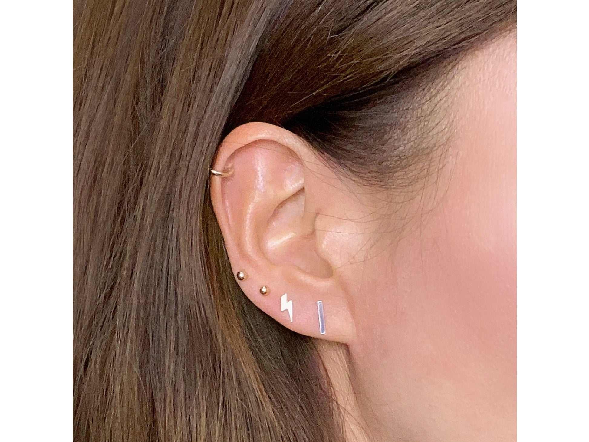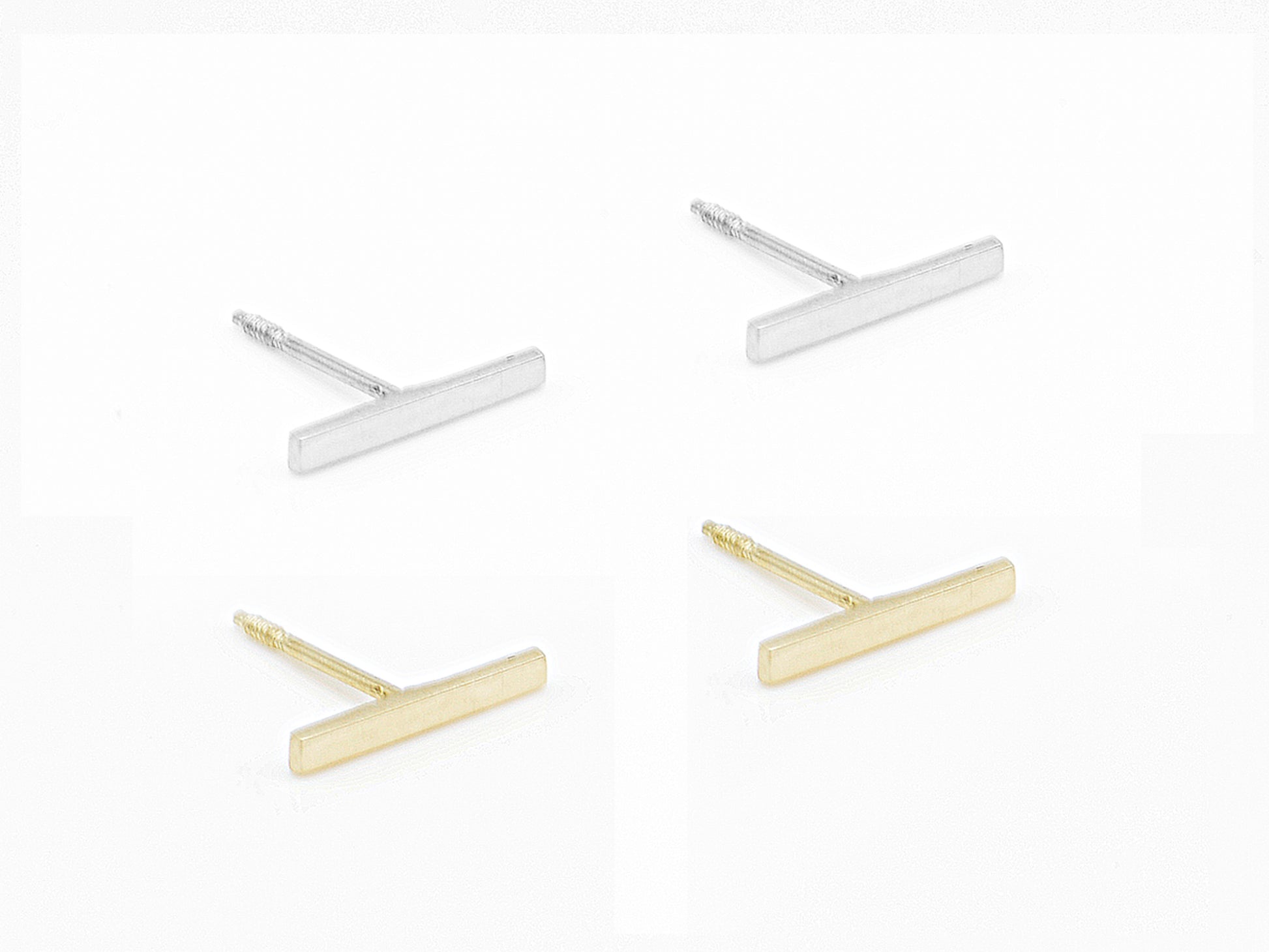 Minimalist gold bar studs that are perfect with any outfit! Wear these studs from a day at work to a night out with the girls they seriously go with everything. Their simple design makes them easy to pair with other studs if you have more than one piercing. Wear them horizontal or vertical.