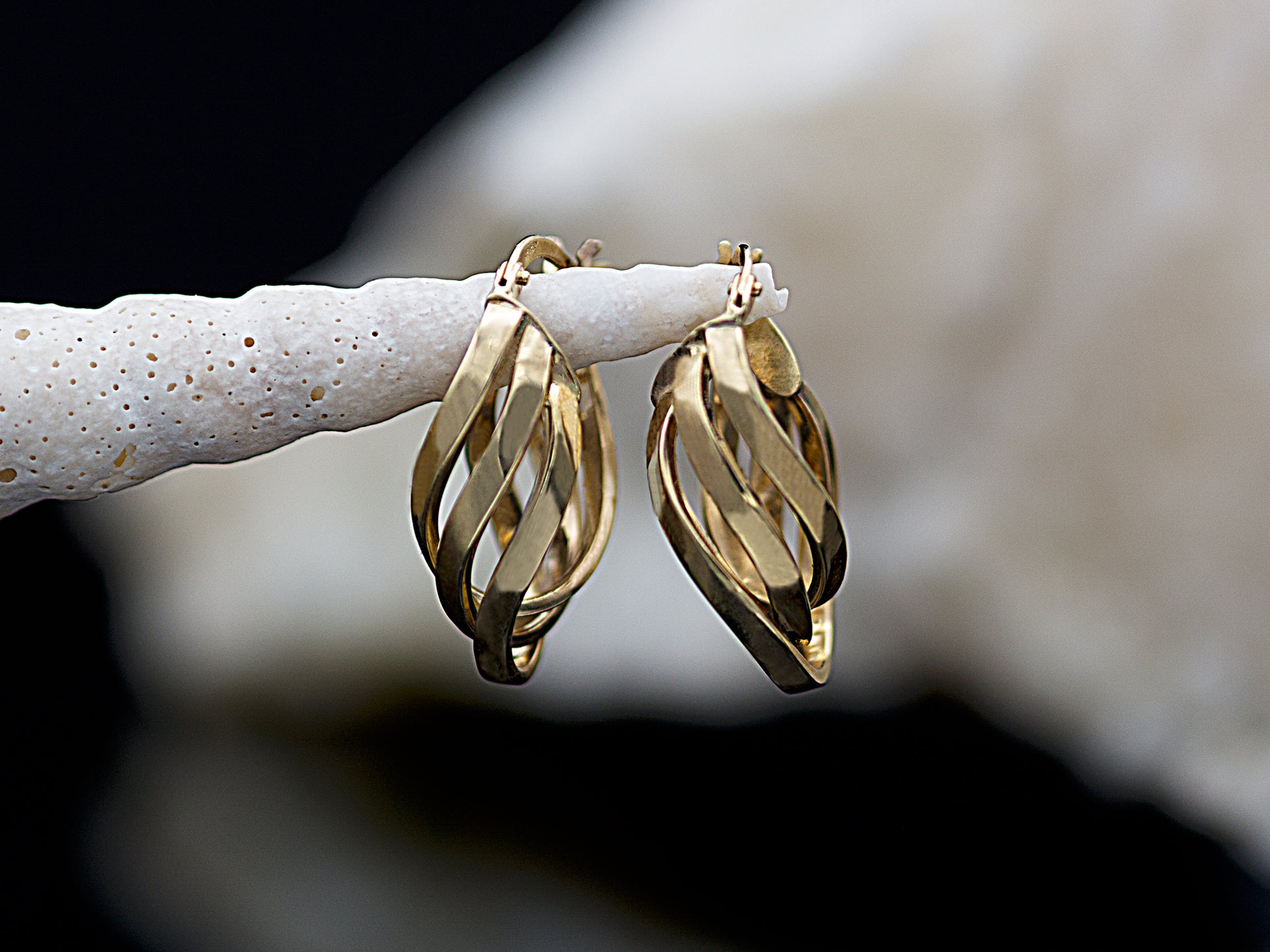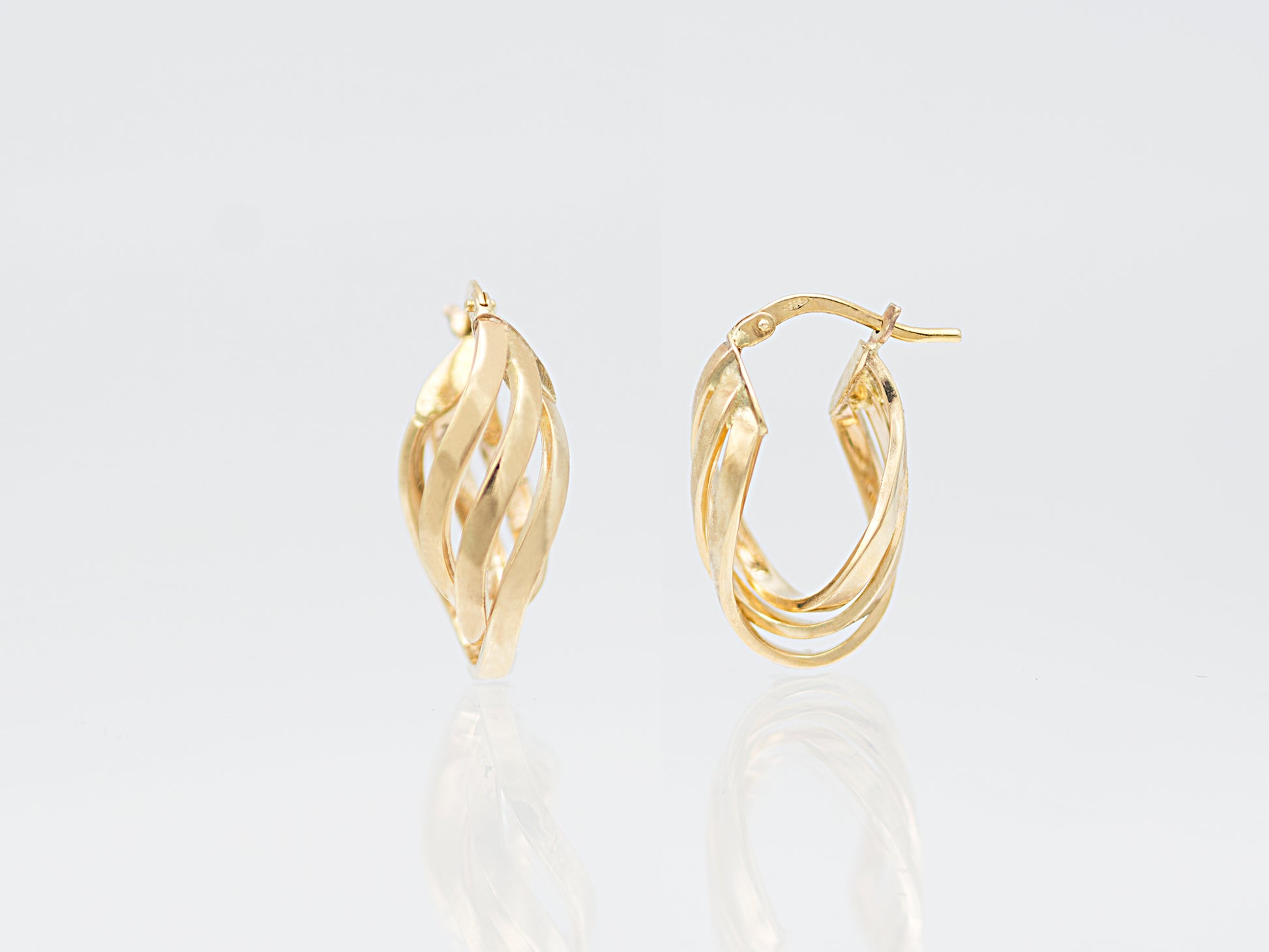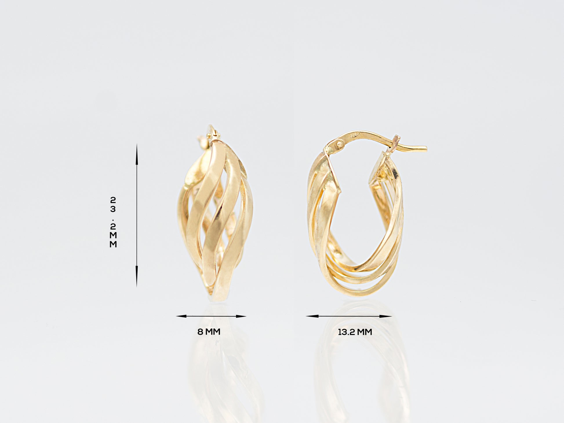 14K Yellow Solid real Gold 3 Line Hoop Earrings, Twisted Geometric Polished handmade earing, Statement bold jewelry, Gift for special event.