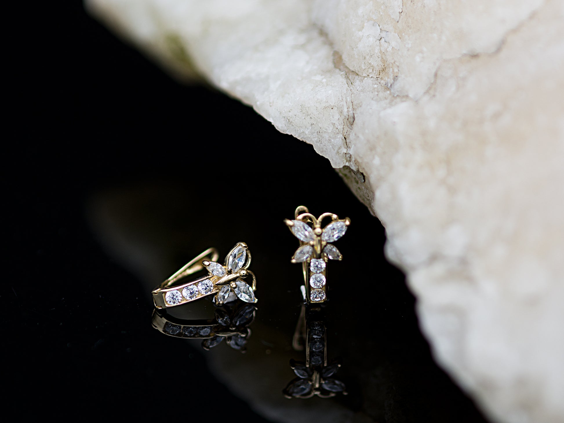 These gold butterfly earrings are accented with sparkling marquise shaped cubic zirconia gemstones.