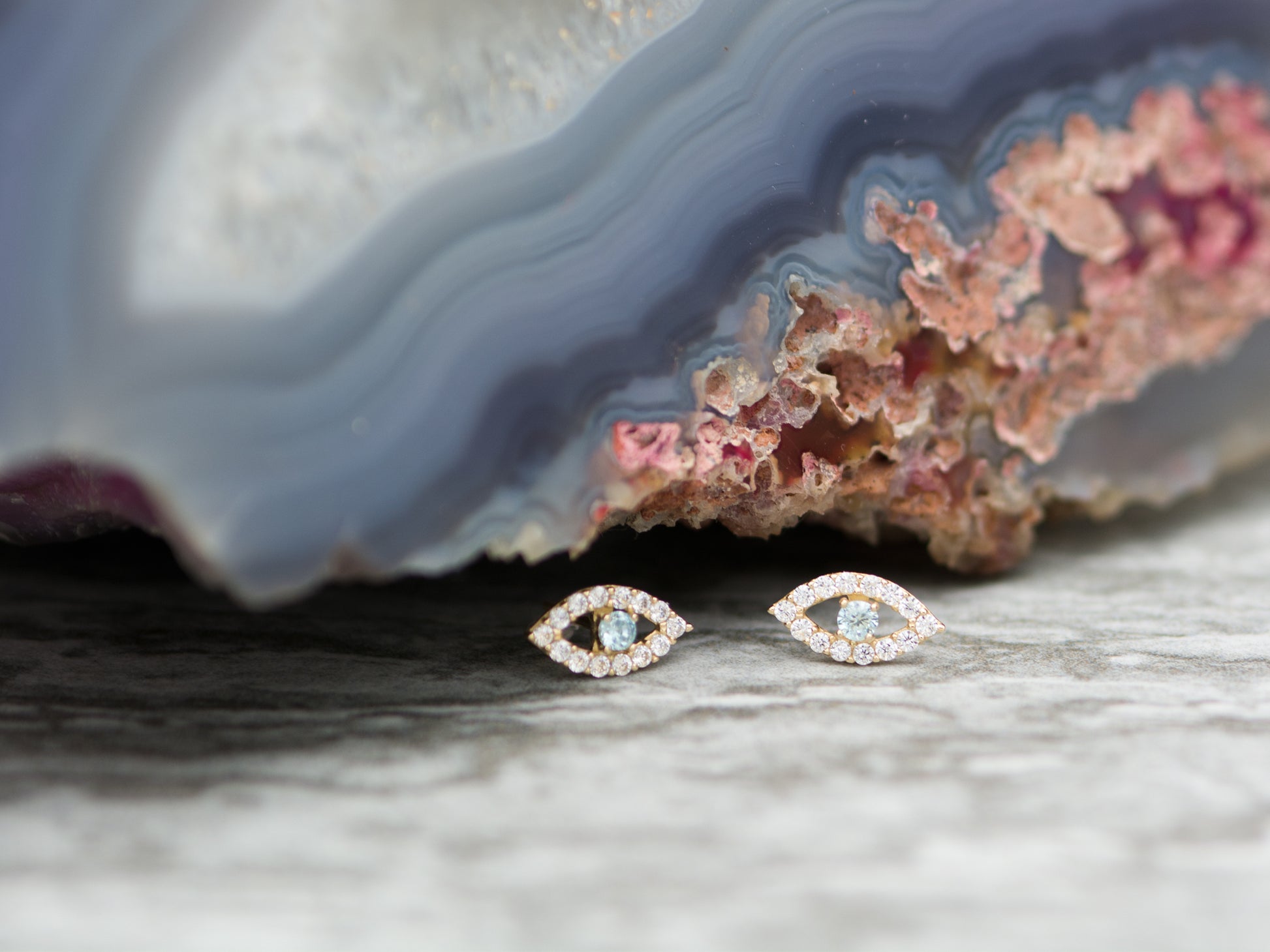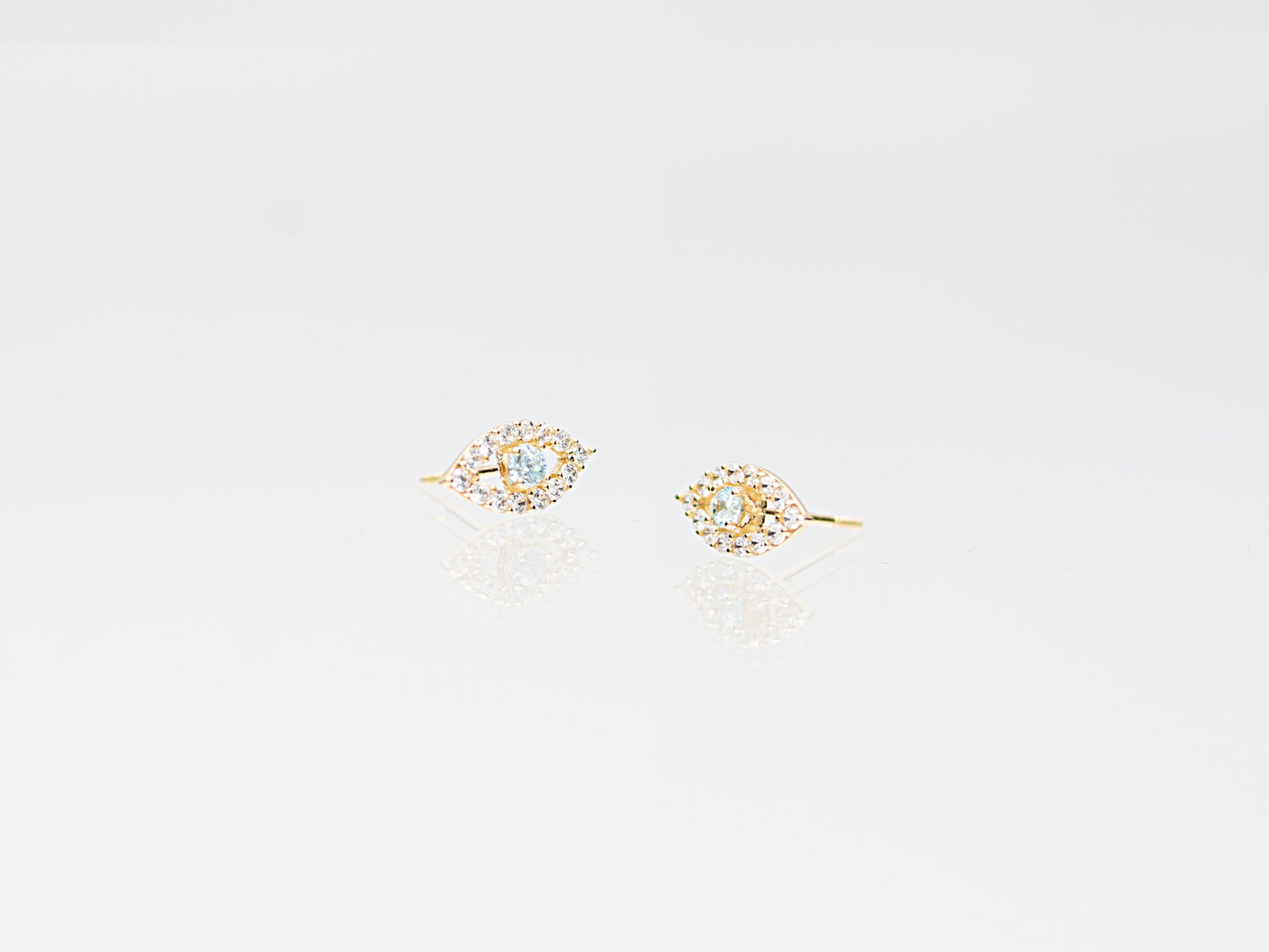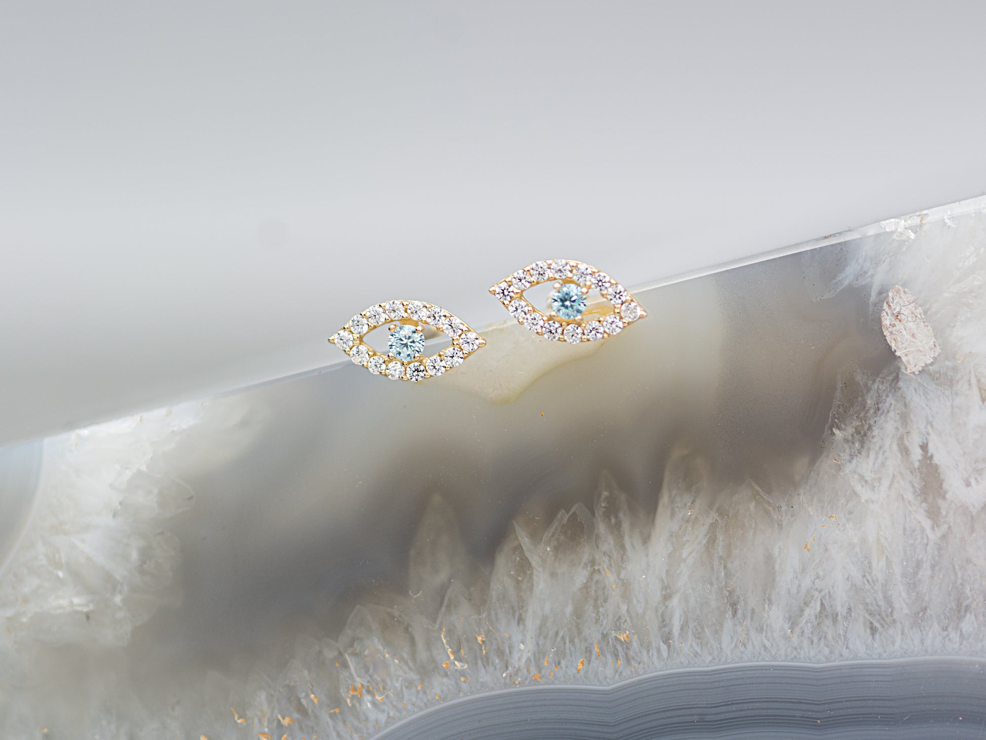 Evil eye stud earrings with brilliant white side stones with gorgeous Sky blue color quartz, they are simple classic everyday jewelry, a great addition to any outfit.