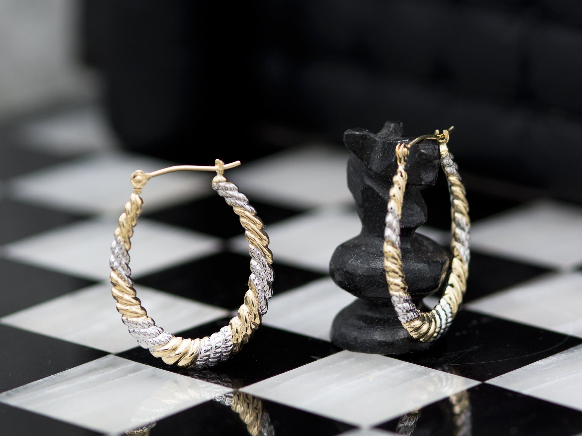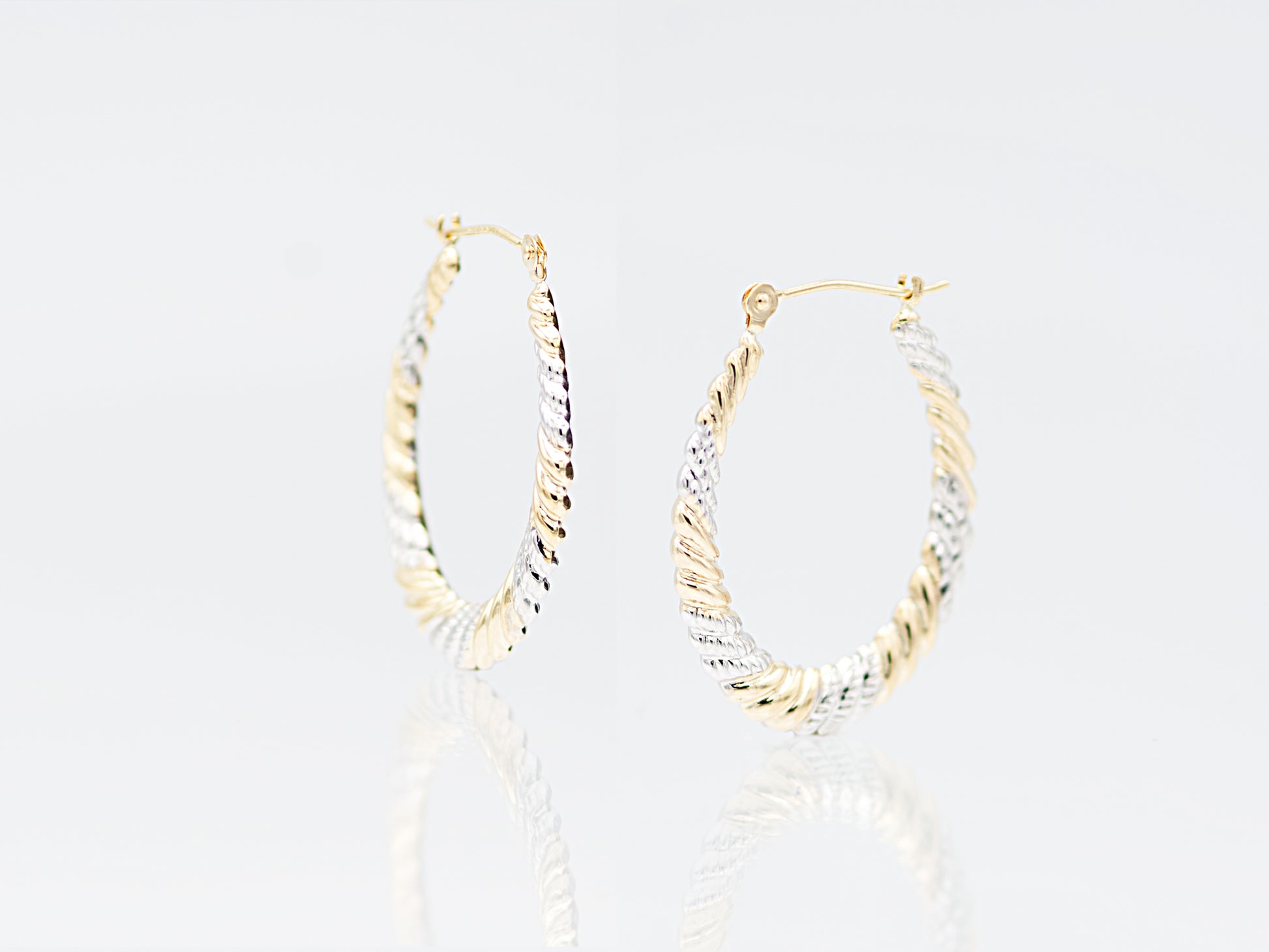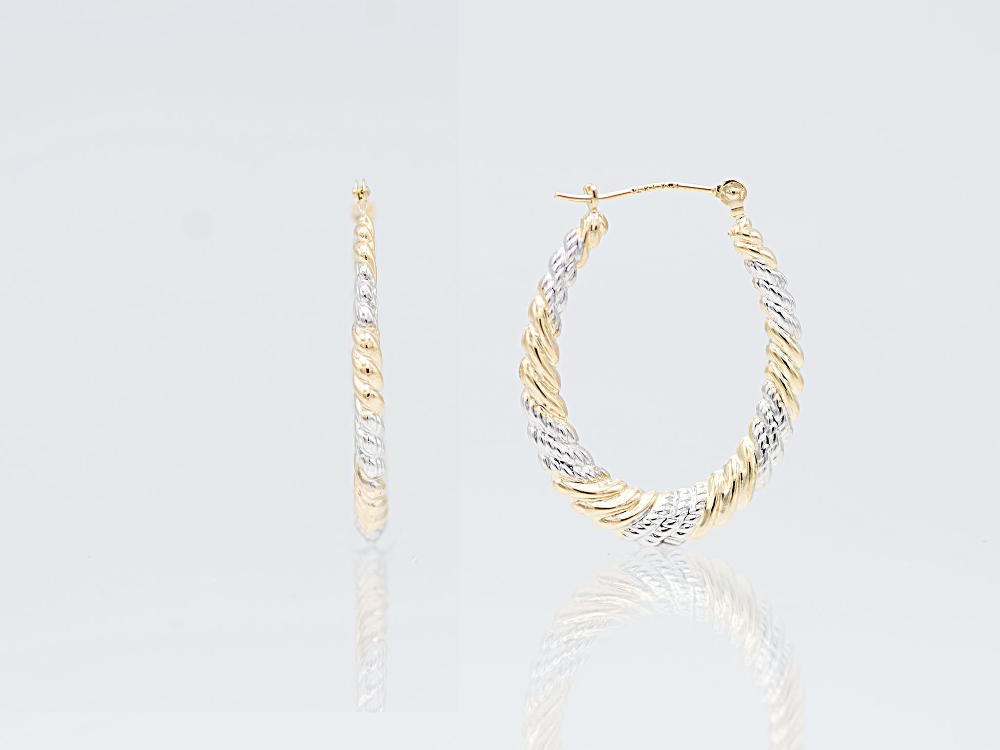Two tone Twisted hoop will give a crisp and clean look that we all been looking for, dress it up for special event or just dress it down with T- shirt and a jean, will work both ways.